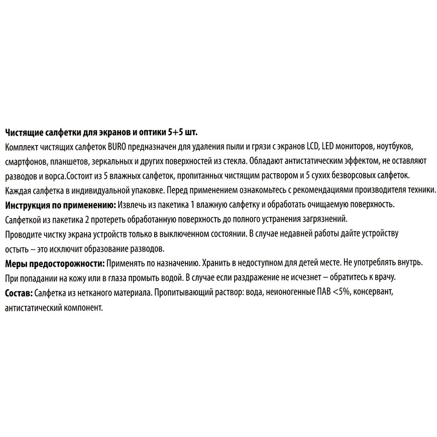 | Описание | Комплект чистящих салфеток BURO включает в себя 5 влажных безворсовых салфеток пропитанных чистящим раствором и 5 сухих безворсовых салфеток. Каждая салфетка в индивидуальной вакуумной упаковке. |