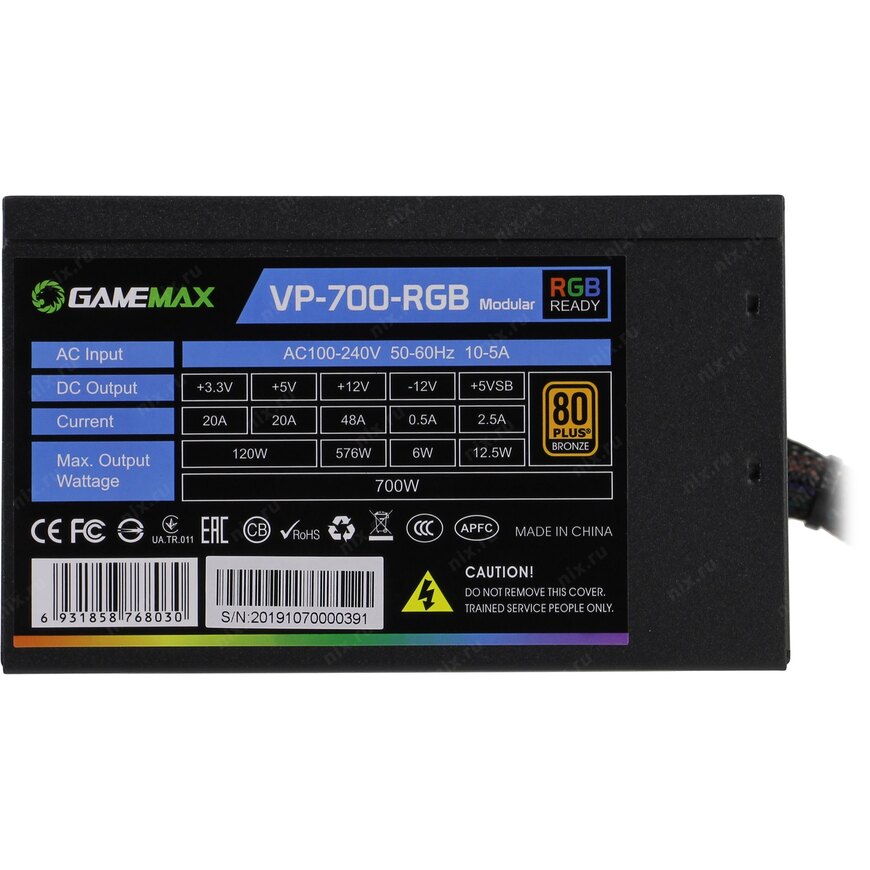 +3.3V - 20A, +5V - 20A, +12V - 48A, +5VSB - 2.5.A, -12V - 0.5A; Комбинированная нагрузка: +3.3V&+5V - 120 Вт