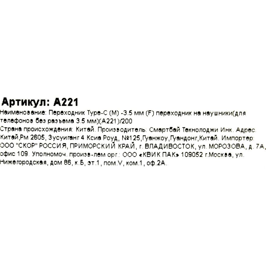 | Описание | Кабель-переходник для подключения наушников с разъемом 3.5 мм к смартфону или планшету с разъемом USB Type C. Рекомендуется для устройств на Android. |