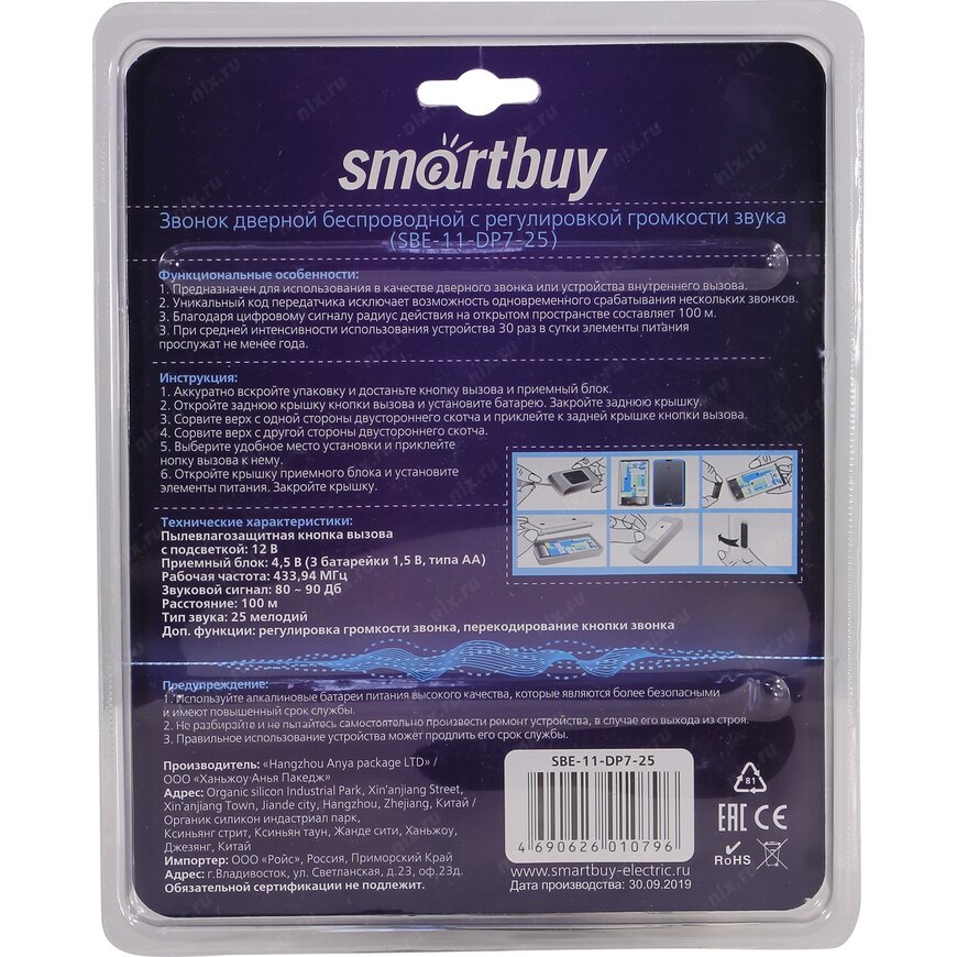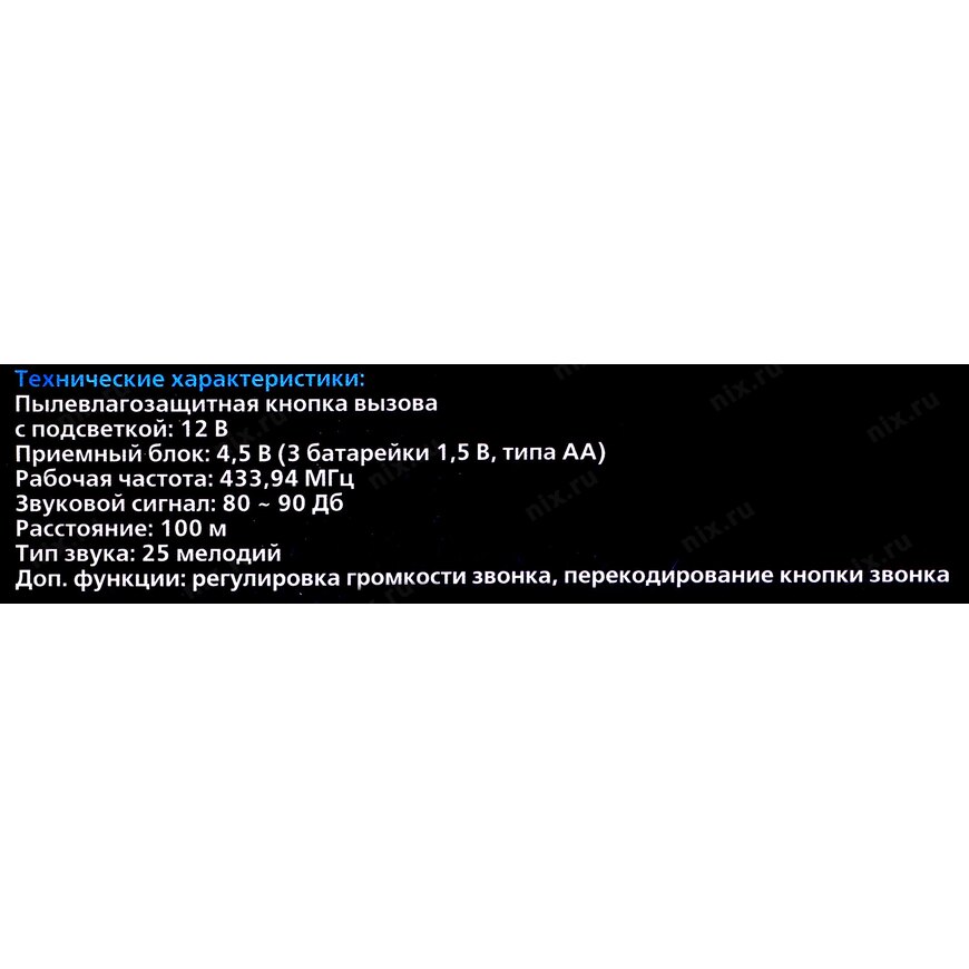 | Описание | Дверной звонок с регулировкой громкости звука беспроводной - кнопка с подсветкой располагается на расстоянии до 100 метров от приемного блока |