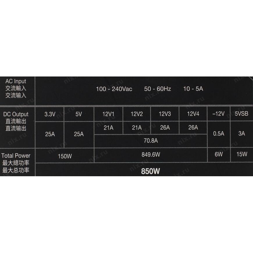 | Максимальная нагрузка | +3.3V - 25A, +5V - 25A, +12V1 - 21A, +12V2 -21A, +12V3 -26A, +12V4 -26A, +5VSB - 3A, -12V - 0.5A; Комбинированная нагрузка: +3.3V & +5V - 150 Вт, 12V - 849.6Вт |