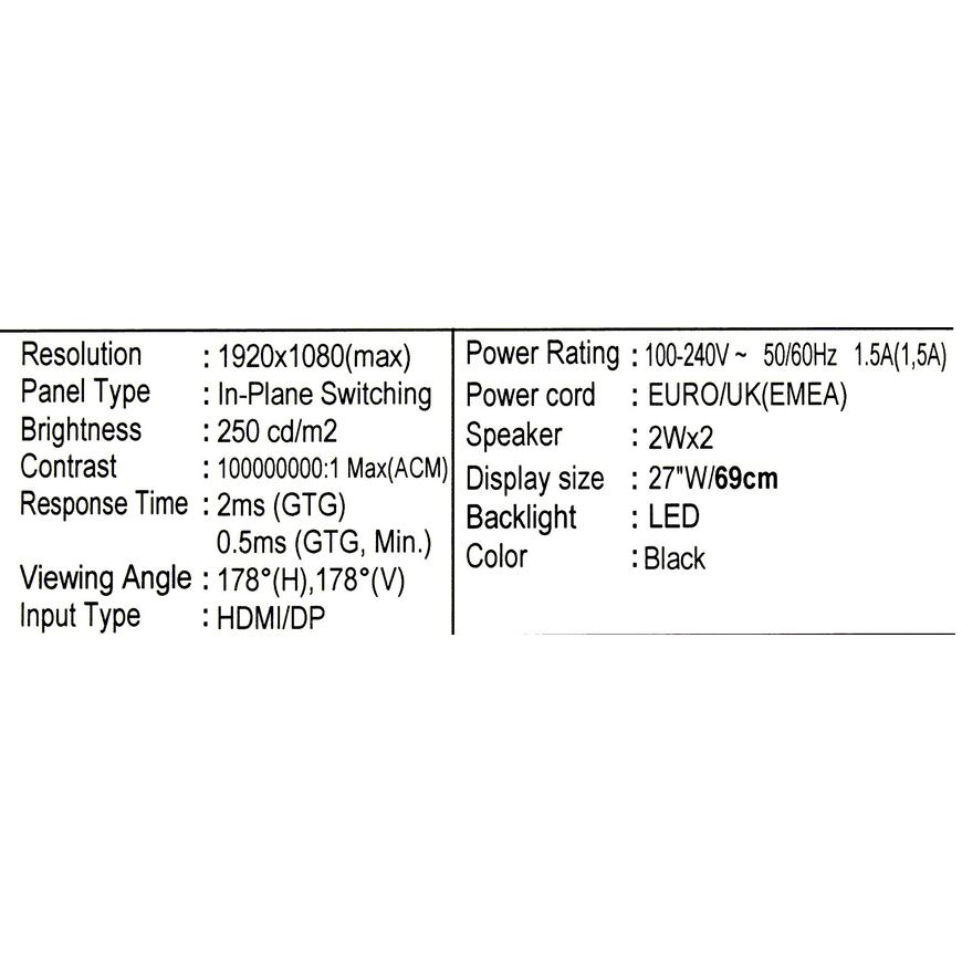 | Комплект поставки | Кабель питания, кабель DisplayPort |