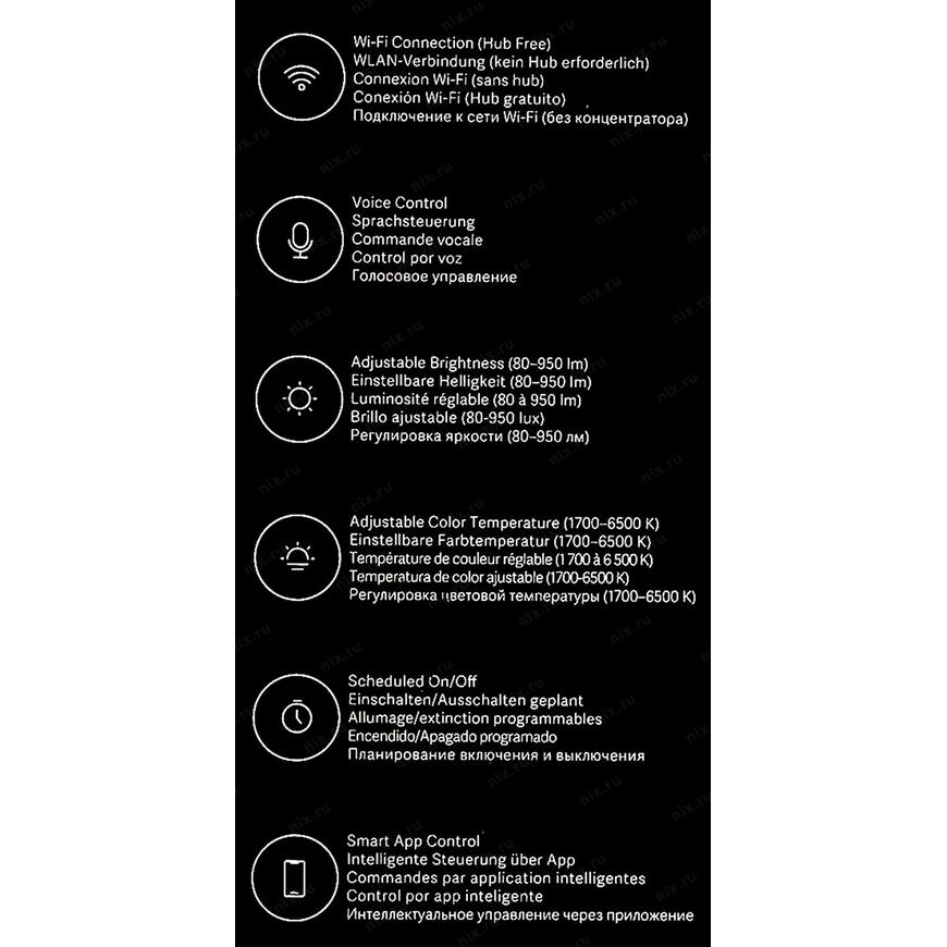| Цветовая температура | 1700К (тёплый белый свет), 2700К (тёплый белый свет), 3000К (тёплый белый свет), 4000К (естественный белый свет), 4500К (естественный белый свет), 5000К (холодный белый свет), 5500К (холодный белый свет), 6000К (холодный белый свет), 6500К (холодный белый свет) |
