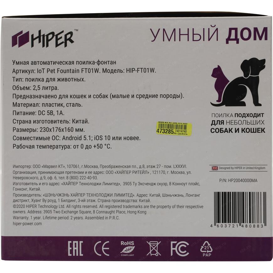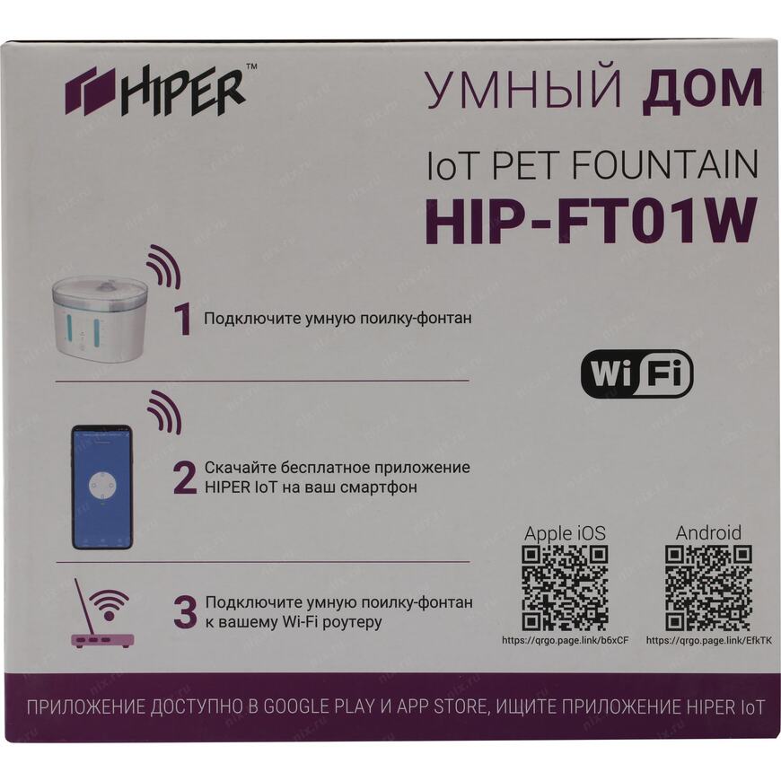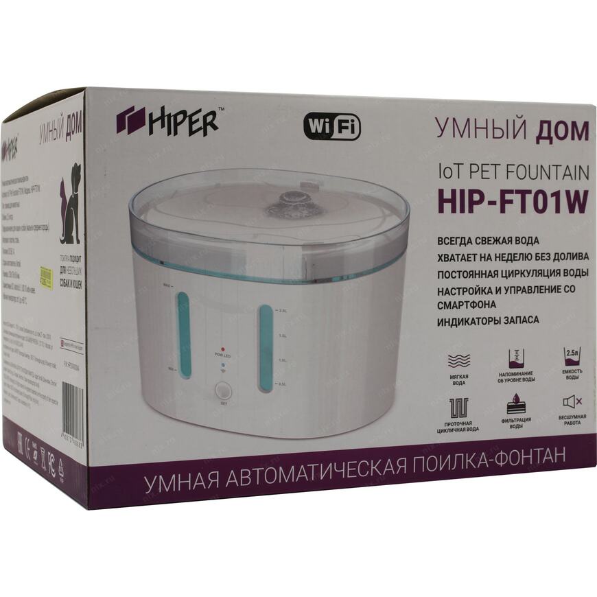 | Возможности | Автоматическая поилка для домашних животных, выполненная в виде фонтана. Встроенный моющийся фильтр смягчает воду, а постоянная циркуляция не позволяет ей застаиваться и портиться. Устройством можно управлять по Wi-Fi с вашего смартфона или планшета в приложении Hiper IoT. Емкость 2 литра |