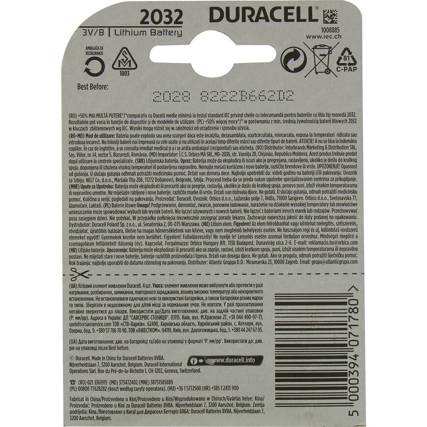 Батарейки CR2032 Duracell CR2032-4 4 шт.