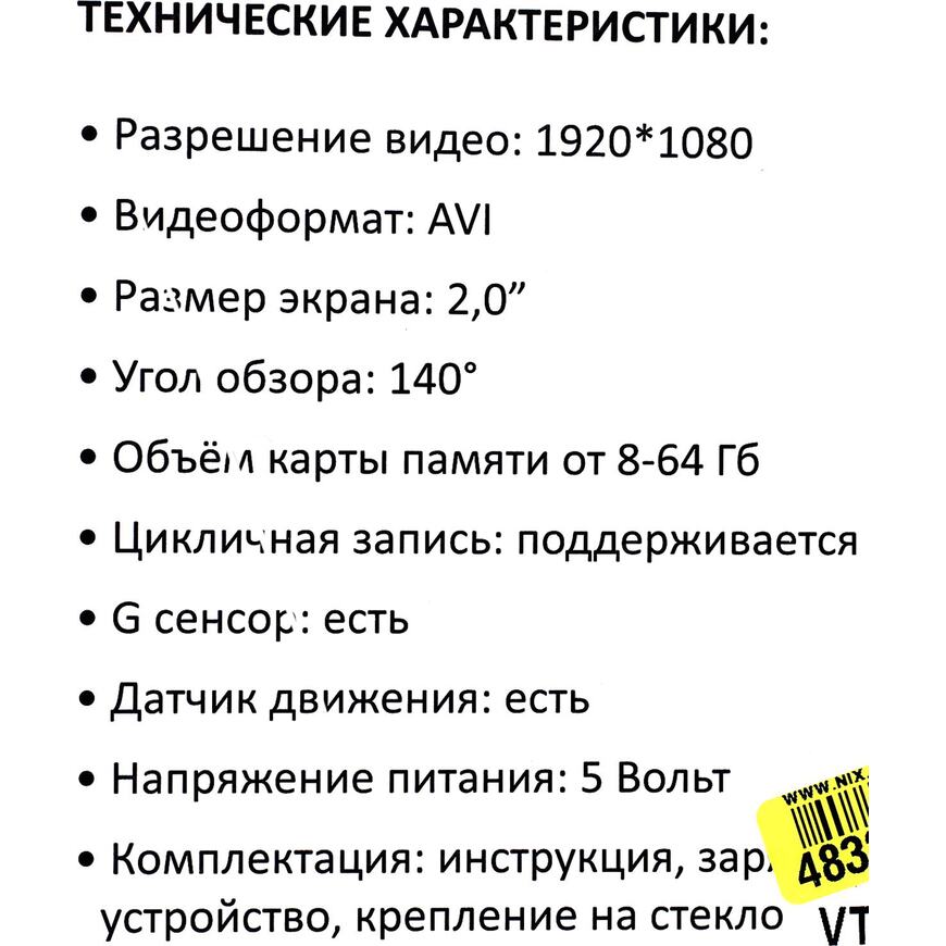 | Разрешение записи видеорегистратора | 1920х1080 (30 кадр/сек) |