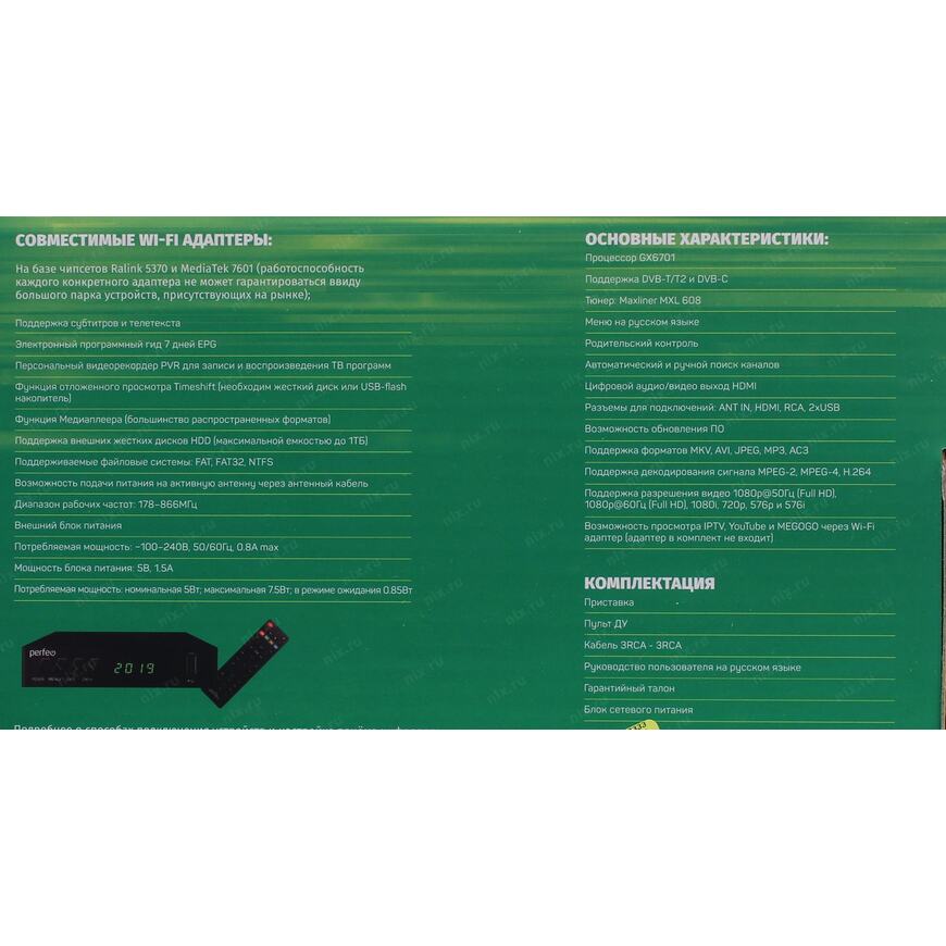 | Описание | Цифровой ресивер DVB-T2 и кабельного DVB-C с функционалом медиаплеера. Для просмотра видео, записи эфирного телевидения или Time Shift можно использовать приобретаемые отдельно внешние USB-накопители. Пульт ДУ в комплекте и меню на русском языке. Возможно подключение к сети интернет с помощью приобретаемого отдельно USB WiFi адаптер на чипсете MTK MT7601. В этом случае будут доступны такие сервисы, как YouTube, Погода, RSS новости, IPTV, MEGOGO |