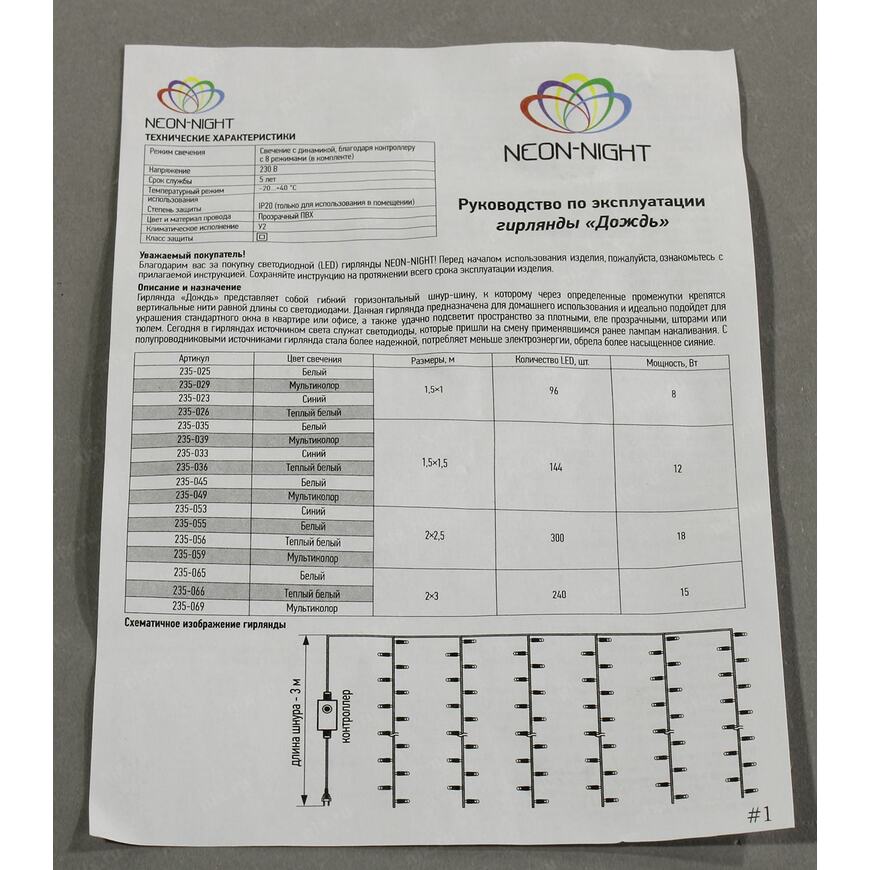| Описание | Гирлянда «Дождь» 1,5x1 м выполнена в виде занавеса, и это идеальное решение для декора окон в квартире, доме или офисе. Трехметровый шнур питания позволяет обойтись без удлинителя. Гирлянда работает при напряжении 230 Вольт и управляется контроллером с 8 разными режимами свечения: 7 динамических и 1 статический. Провод заключен в оболочку из гибкого прозрачного ПВХ. 96 диодов горят синим цветом. |