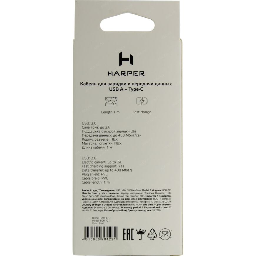 Кабель USB 2.0 A -> Type C HARPER BCH-721 Black 1 метр