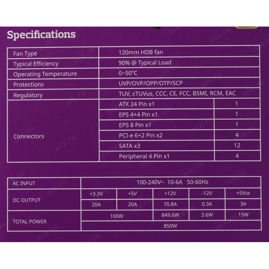 | Максимальная нагрузка | +3.3V - 20A, +5V - 20A, +12V - 70.8A, +5VSB - 3A, -12V - 0.3A; Комбинированная нагрузка: +3.3V&+5V - 100 Вт |