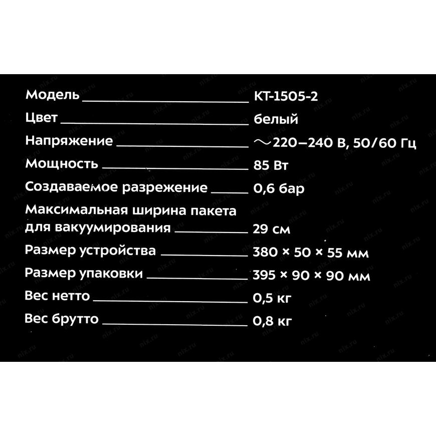 | Описание | Вакууматор Kitfort КТ-1505 - современный прибор, призванный увеличить сроки хранения пищевых продуктов. Продукты, упакованные под вакуумом, сохраняют свежесть и не портятся существенно дольше по сравнению с обычными условиями хранения. Максимальная ширина пакета для вакуумирования 29 см. |