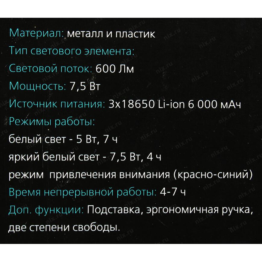 | Ресурс аккумулятора (аккумуляторов) | до 7 часов (средняя яркость), до 4 часов (максимальная яркость) |