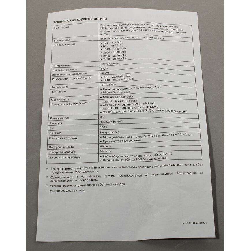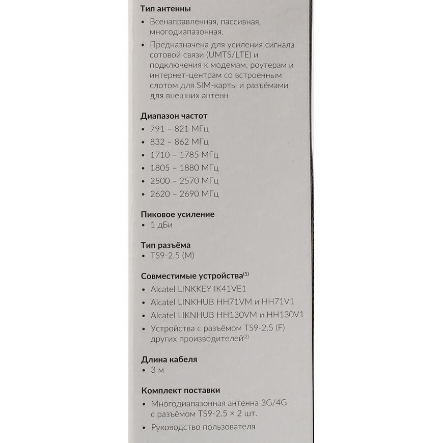 | Совместимость | Alcatel LINKKEY IK41VE1, LINKHUB HH71VM, HH71V1, LIKNHUB HH130VM, HH130V1 и другие модемы/роутеры с разъемами TS-9 |