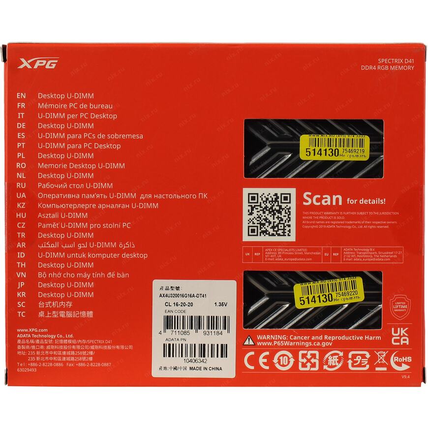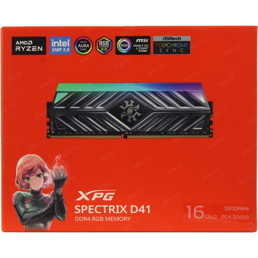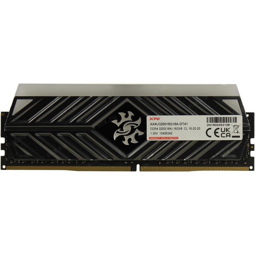 | Описание | Модуль памяти ADATA 32GB (2x16GB) DDR4 UDIMM, XPG SPECTRIX D41, 3200MHz CL16-20-20, 1.35V, RGB, Серый Радиатор |
