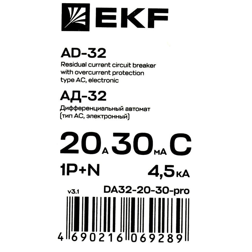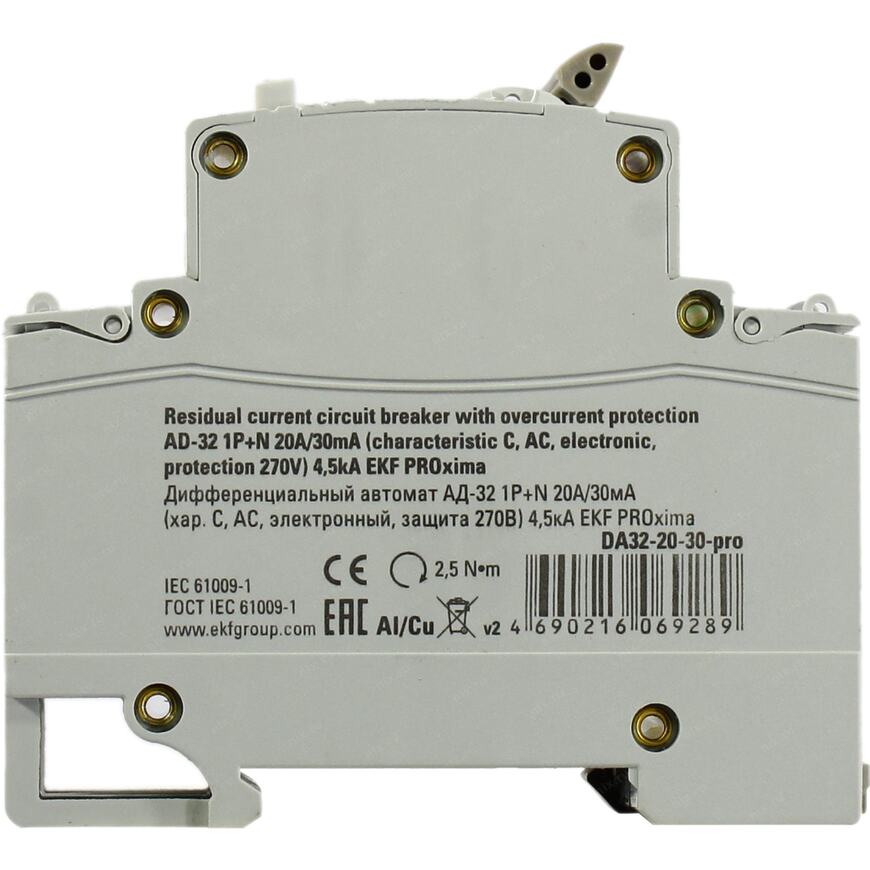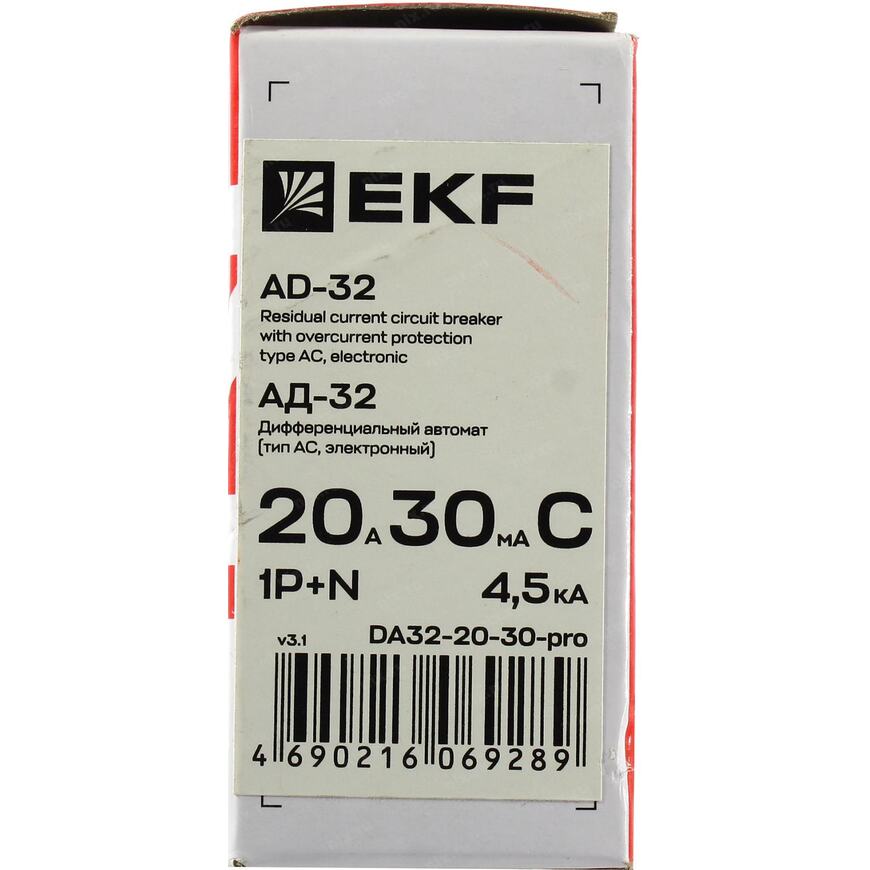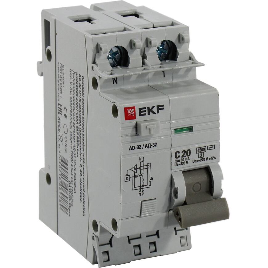 [EKF Дифавтоматы] EKF DA32-20-30-pro Дифференциальный автомат АД-32 1P+N 20А/30мА (хар. C, AC, электронный, защита 270В) 4,5кА EKF PROxima