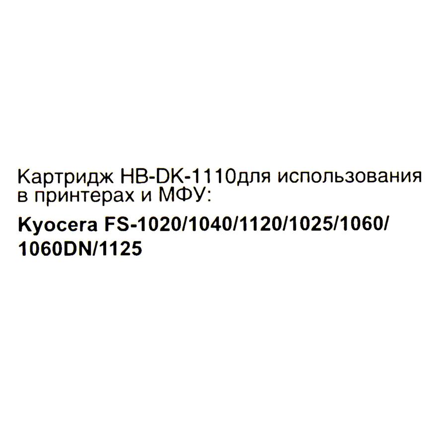 Драм-картридж Hi-Black (HB-DK-1110) для Kyocera FS-1020/ FS-1040/ FS-1120/ FS-1025/ FS-1060/ FS-1125, чёрный (100000 стр.) Дополнительная информация о товаре: Драм-картридж Hi-Black (DK-1110) для монохромных лазерных принтеров и МФУ Kyocera. Ресурс составляет 100000 копий при 5% заполнении листа (данный показатель может изменяться в виду особенностей тех или иных настроек, выставляемых при печати). Совместимость с печатающими устройствами: Kyocera FS-1020, FS-1040, FS-1120, FS-1025, FS-1060, FS-1125; Аналог производителя: DK-1110, 302M293013 черный, Drum Unit Black; Виды номенклатур - Драм-картридж, драм-юнит, блок фотобарабана, фотобарабан, Drum Cartridge, Drum Unit; При производстве совместимого картриджа Hi-Black серии DK-1110 используются надёжные комплектующие, запчасти, качественные расходные материалы. Соблюдение этих технических условий позволяет повторно заправлять и восстанавливать картридж. Вся продукция прошла тщательное тестирование и не уступает оригинальным расходным материалам, обеспечивая высокое качество печати по разумной цене.