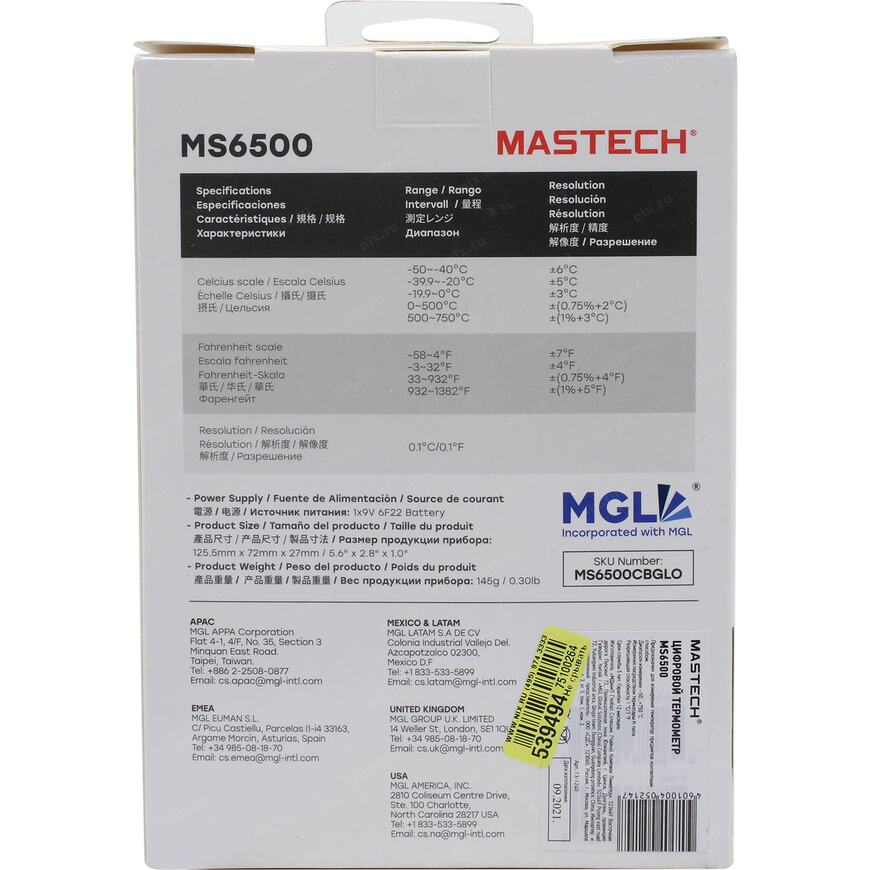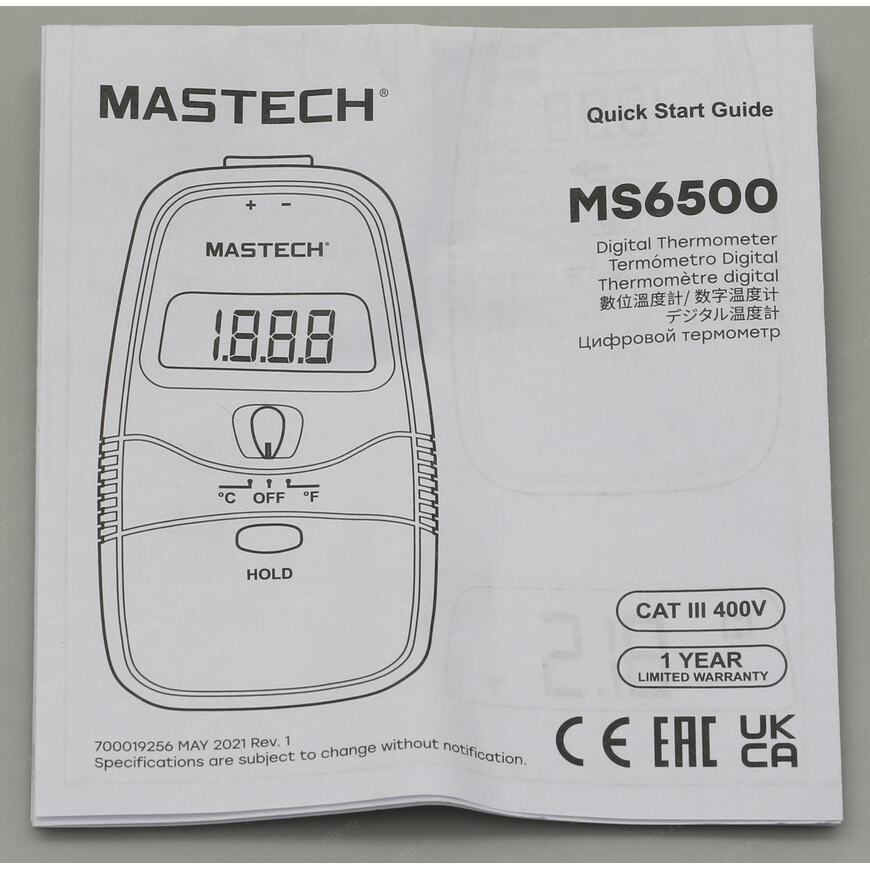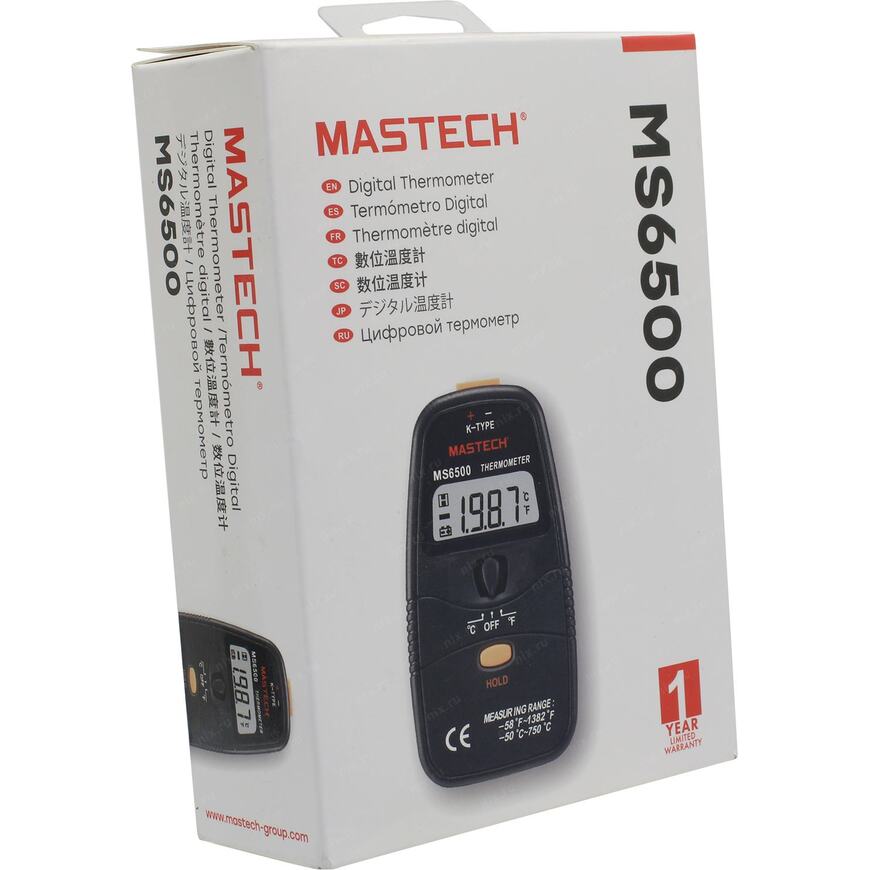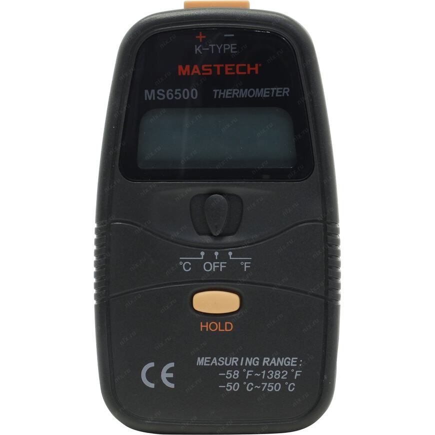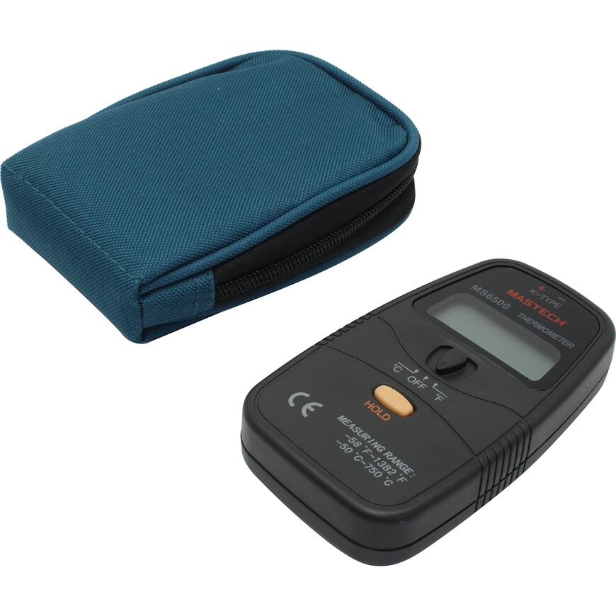 | Возможности | Цифровой термометр Mastech MS6500 позволяет измерить температуру окружающей среды или какого-либо предмета. В приборе применяется термопара типа "К", которая подключается через разъём в верхней части корпуса. |