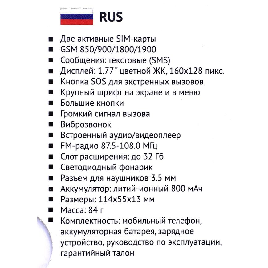 | Описание | Простой кнопочный телефон с большими кнопками, радио, вибрацией громким сигналом вызова. Отлично подходит пожилым людям с ослабленным зрением и координацией движений |