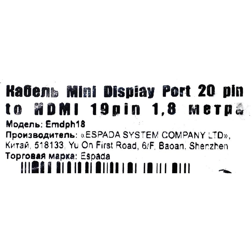 Переходник miniDisplayPort -> HDMI Espada Emdph18 Черный 1.8 м.