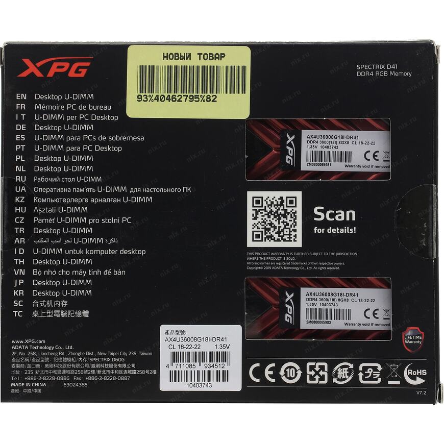 | Описание | Модуль памяти ADATA 16GB (2 x 8Gb) DDR4 UDIMM, XPG SPECTRIX D41, 3600MHz CL18-22-22, 1.35V, RGB + Красный Радиатор |