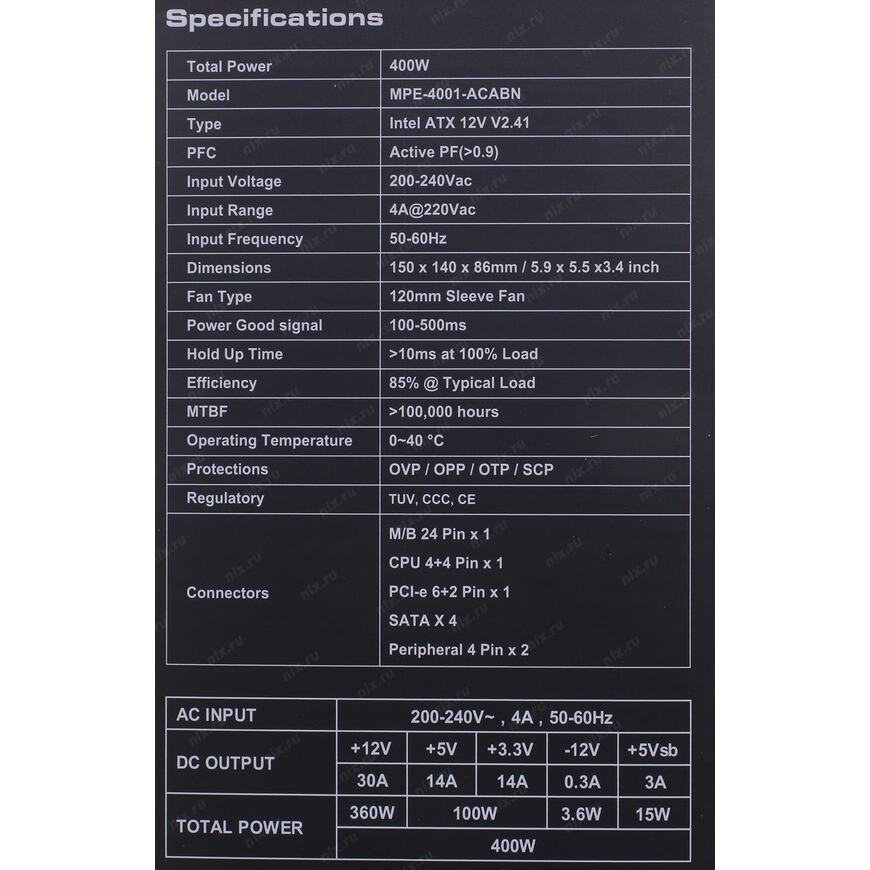 | Максимальная нагрузка | +3.3V - 14A, +5V - 14A, +12V - 30A, +5VSB - 3A, -12V - 0.3A; Комбинированная нагрузка: +3.3V&+5V - 100 Вт |