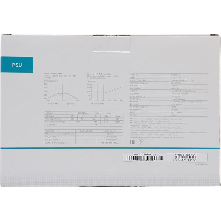 +3.3V - 15A, +5V - 15A, +12V - 52A, +5VSB - 2.5A, -12V - 0.3A; Комбинированная нагрузка: +3.3V&+5V - 100 Вт