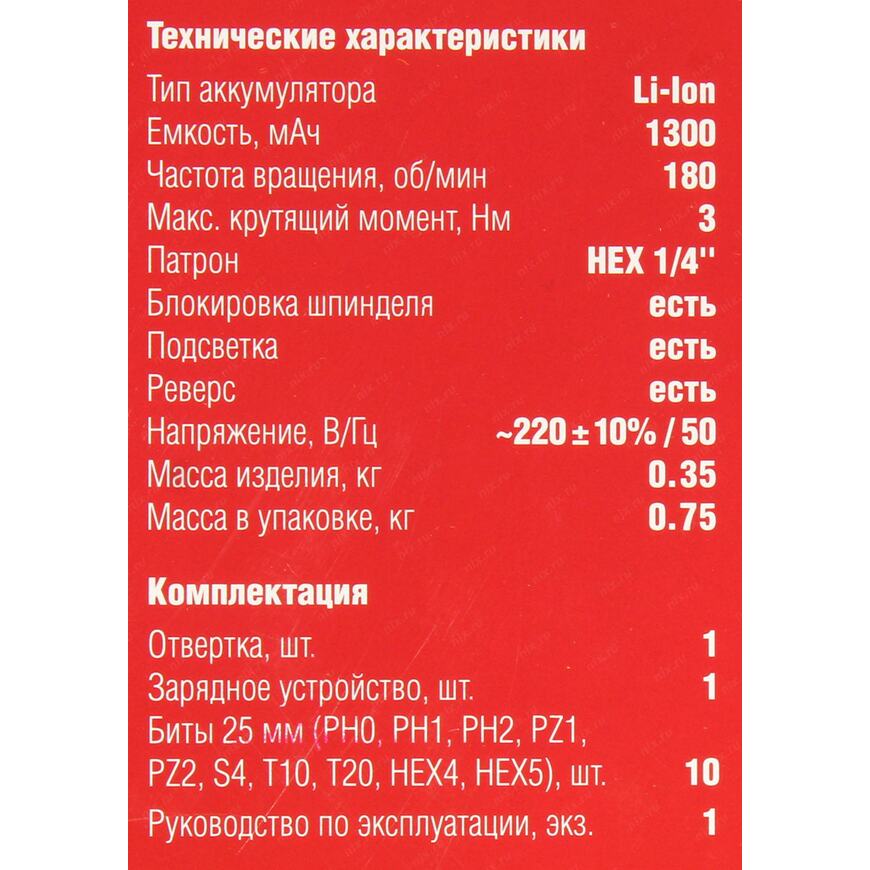 | Комплект поставки | Зарядное устройство, Набор бит Биты 25 мм 10 шт.: PH0, PH1, PH2, PZ1, PZ2, S4, T10, T20, HEX4, HEX5 |