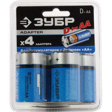| Описание | Зубр 59278-4D представляет собой переходник, позволяющий использовать стандартные батарейки типа АА и никель-металлогидридные аккумуляторы вместо элементов питания типа D. В упаковке 4 адаптера |