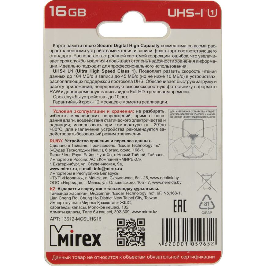 Карта памяти Mirex 13612-MCSUHS16 microSDHC UHS-I Class 1 (U1) 16 ГБ