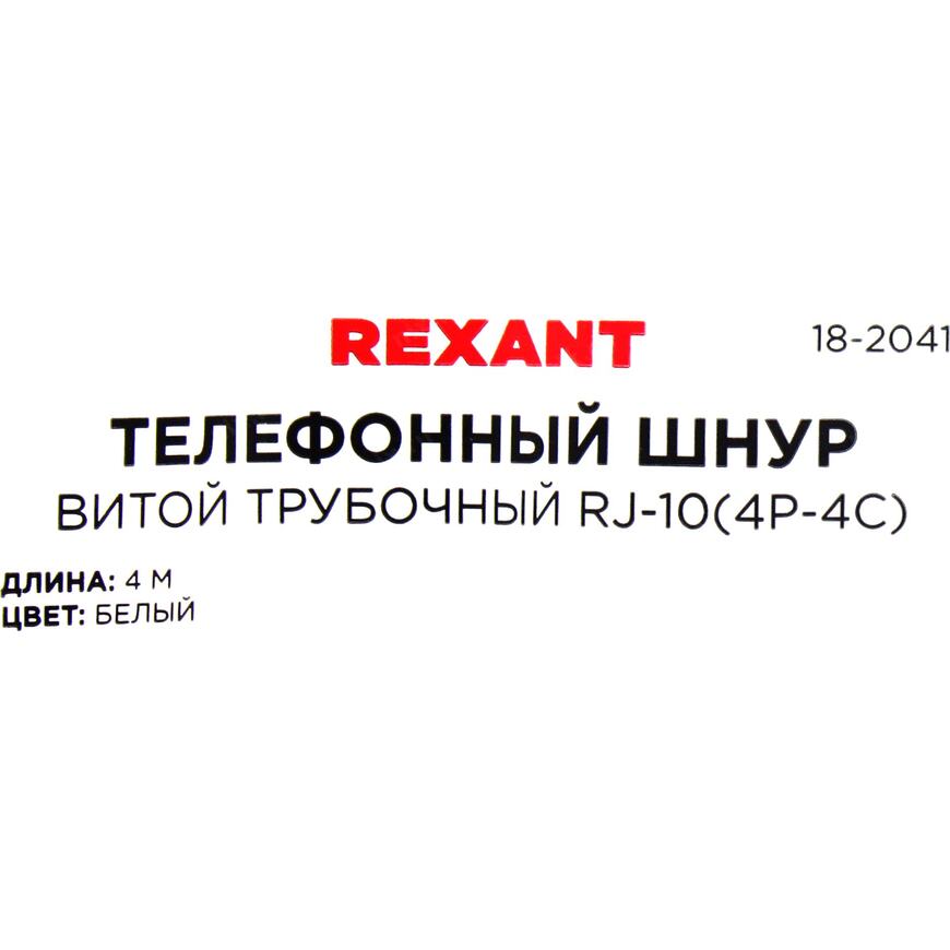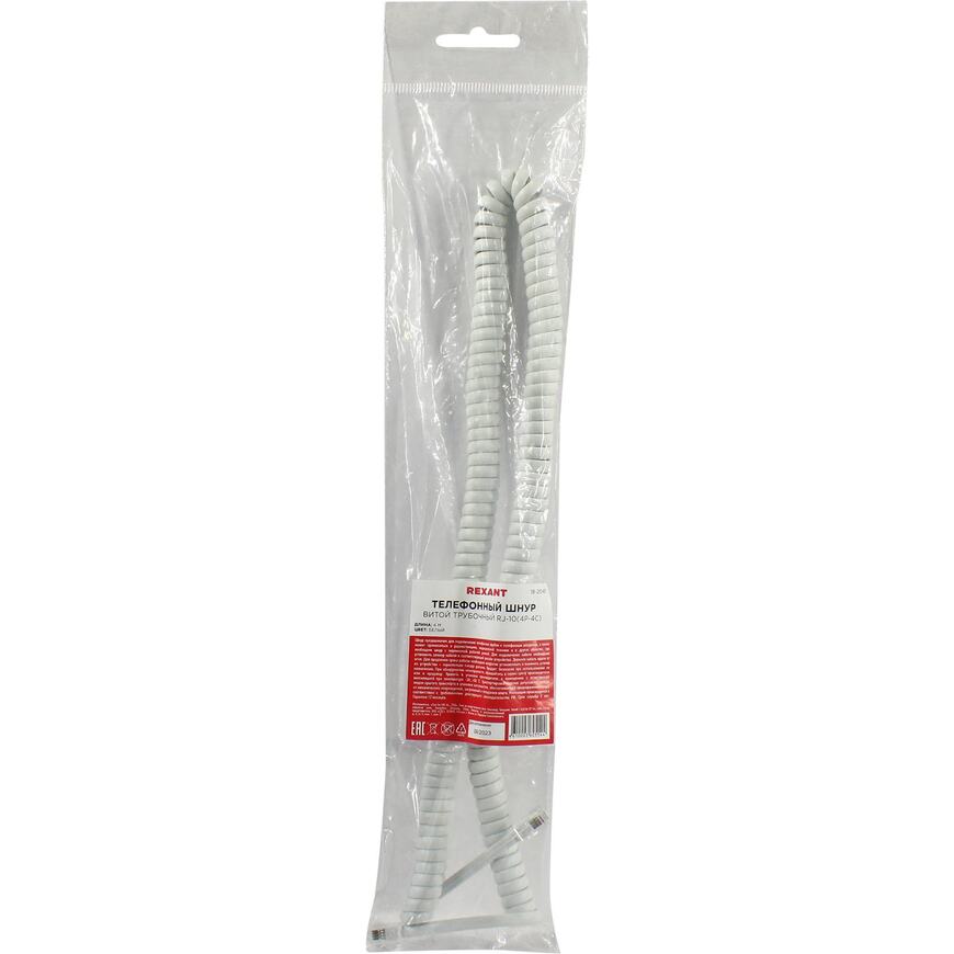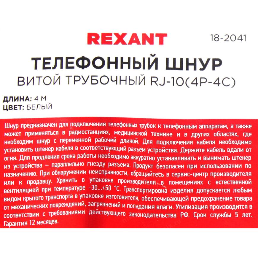 Шнур витой трубочный 4 м телефонный белый REXANT предназначен для подключения телефонных трубок к телефонным аппаратам, а также может применяться в радиостанциях, медицинской технике и в других областях, где необходим шнур с переменной рабочей длиной. Шнур представляет собой витой кабель, на концах которого располагаются опрессованные разъемы RJ-10 (4P4C).