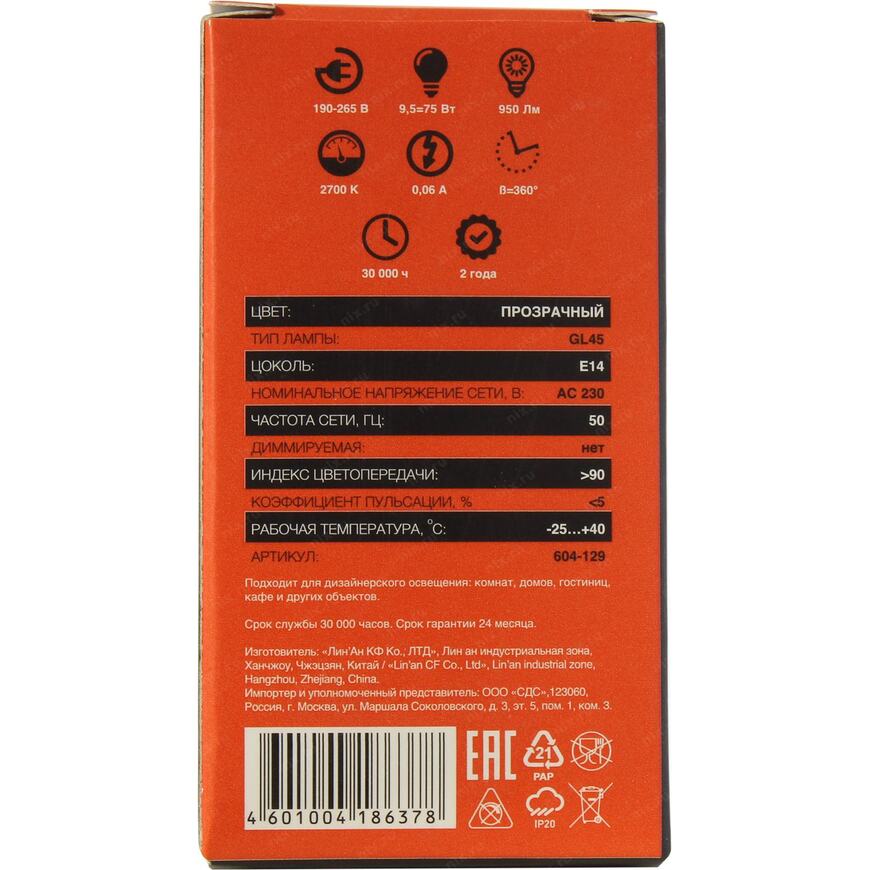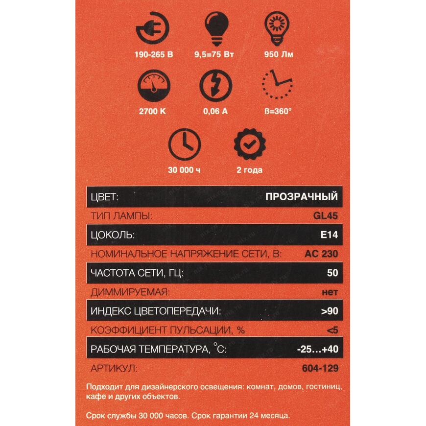 | Модель | (604-129) Шарик GL45 9.5 Вт 950 Лм 2700K E14 прозрачная колба |