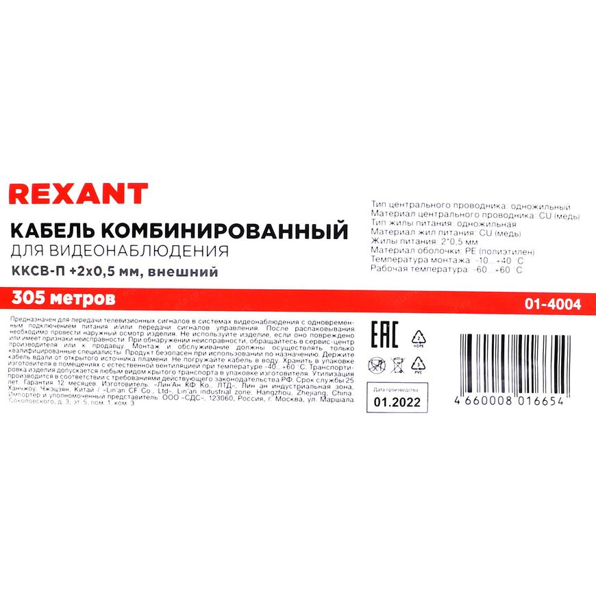 | Описание | В составе систем видеонаблюдения применяется особый вид кабеля - комбинированный. Комбинированный кабель состоит из коаксиального кабеля, передающего высокочастоный видеосигнал приемнику, и двух жил питания, необходимых для энергоснабжения камеры. Коаксиальная часть кабеля видеонаблюдения +2 жилы 305м черный ККСП REXANT представляет собой медный коаксиал 3с-2v с центральным проводником, выполненном из высококачественной меди, и медным экраном, защищающим сигнал от помех. Два дополнительных провода питания представляют собой медные моножилы, диаметр которых равен 0,5 мм. Комбинированный кабель видеонаблюдения +2 жилы 305м черный ККСП REXANT имеет полиэтиленовую изоляцию и окрашен в черный цвет. Полиэтилен защищает кабель от влаги, ультрафиолета и температурных перепадов. Кабель возможно прокладывать вне помещений. |