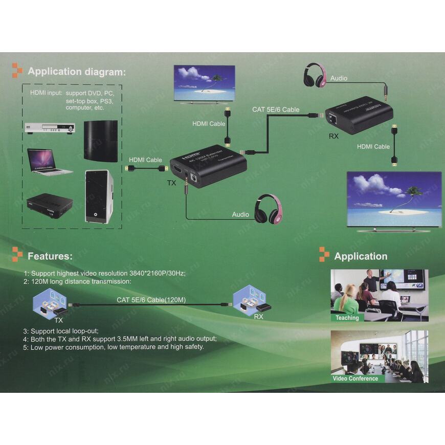 | Описание | Устройство для передачи сигнала HDMI с максимальным разрешением 3840x2160 с частотой 30 Гц на расстояние до 120 метров через сетевой кабель UTP категории 6 |