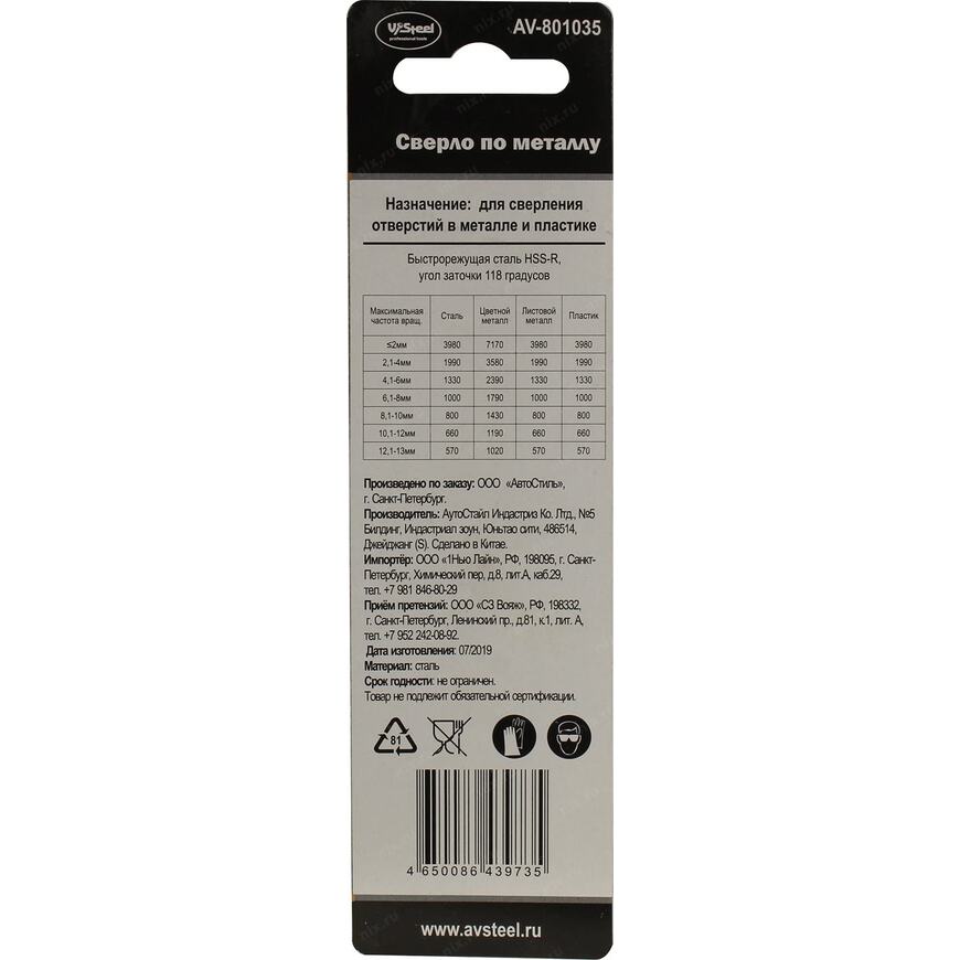 Сверло по металлу AUTOvirazh AV-801035