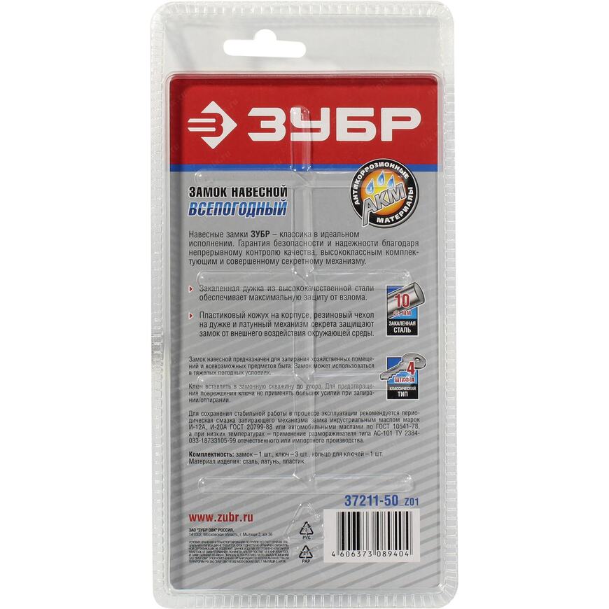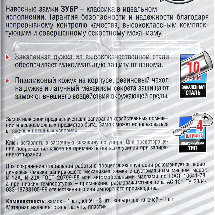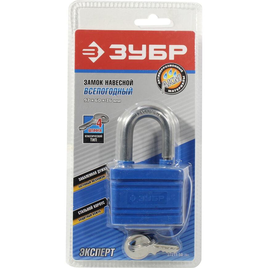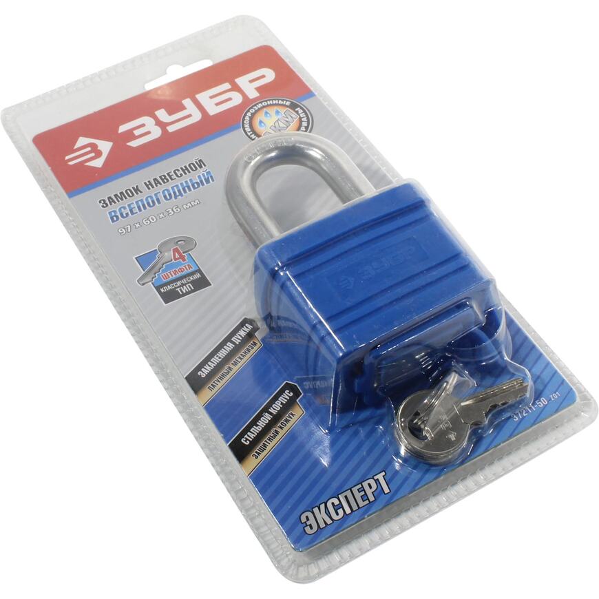 Навесной замок ЗУБР 37211-50_z01, предназначен для запирания хозяйственных помещений и всевозможных предметов быта. Надежный механизм секретности, высококачественные комплектующие и непрерывный контроль качества гарантируют надежность и безопасность при использовании. Закаленная дужка из высококачественной стали обеспечивает максимальную защиту от взлома. Пластиковый кожух на корпусе и резиновый чехол на дужке и латунный механизм секрета защищают замок от внешнего воздействия окружающей среды.
