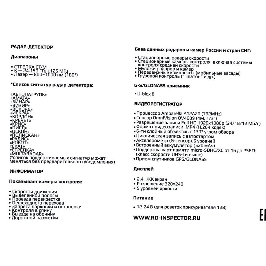 | Прочее | Процессор Ambarella A12A20 Встроенный высокочувствительный радар-детектор, адаптированный к российским камерам ДПС комплекса «Стрелка» Режимы работы радар-детектора: Город1/ Город2/Город3/Трасса/IQ. Рабочие диапазоны: X-диапазон (Сокол, Барьер): 10475 - 10575 МГц; K-диапазон (Радис, Визир, Арена, Места, Мультарадар, Кордон, Крис-П): 24025 - 24275 МГц; Детектор лазерного излучения (Poliscan, TruCam, UltraLite, Лисд-2, Амата): 800 ~ 1000 нм; Определяет радары типа "Робот". GPS-информатор: оповещение о стационарных камерах видеофиксации и муляжах камер |