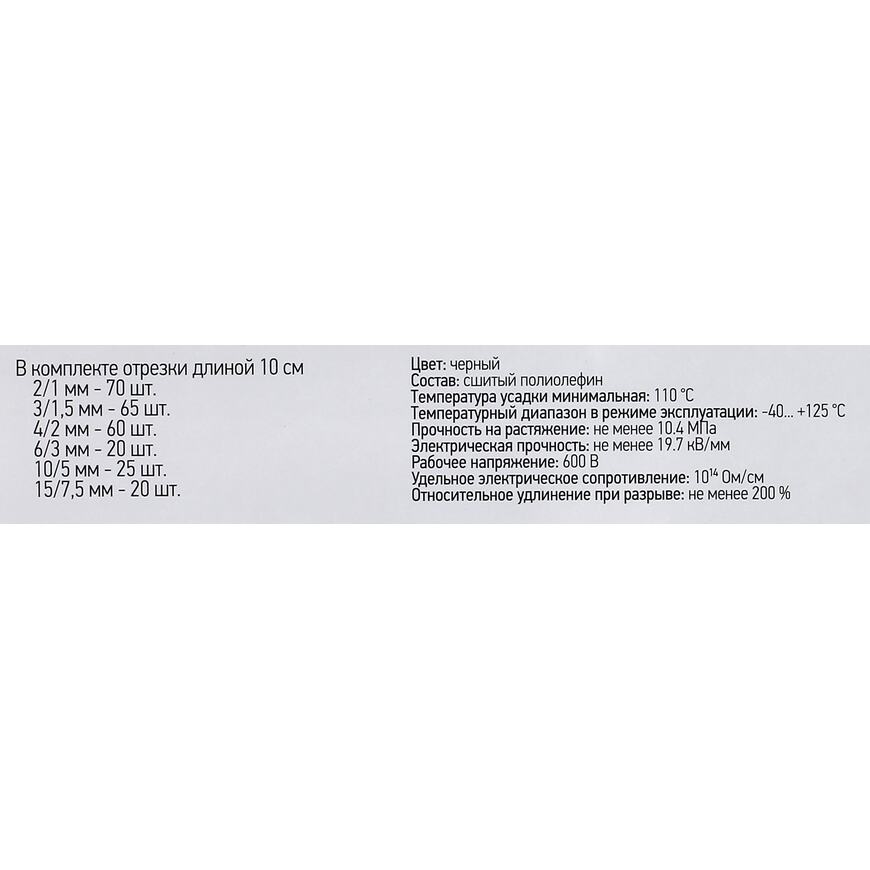 | Прочее | Диаметры: 2 / 3 / 4 / 6 / 10 / 15 мм; Коэффициент усадки: 2:1; Удлинение до разрыва: 200% |