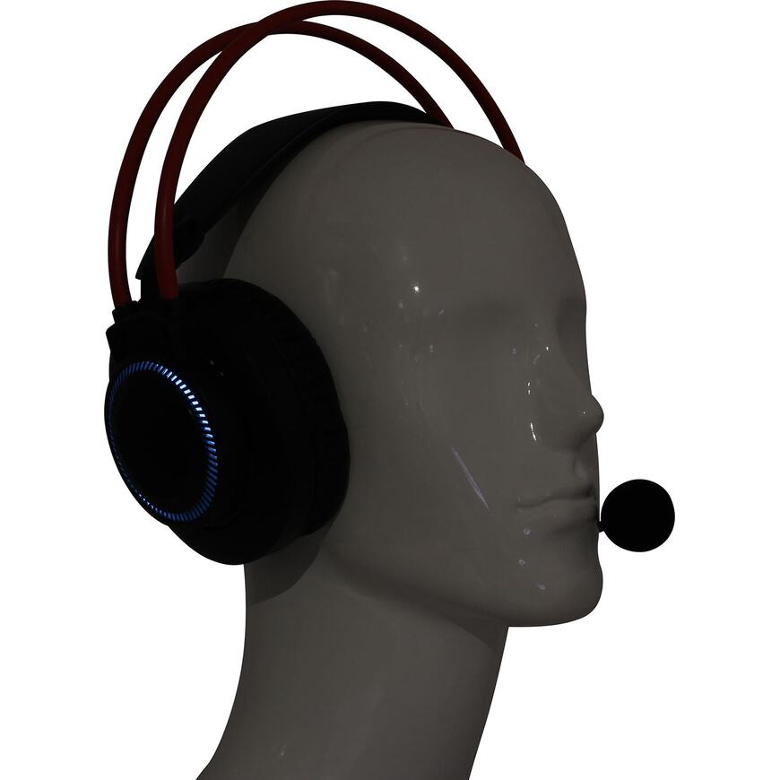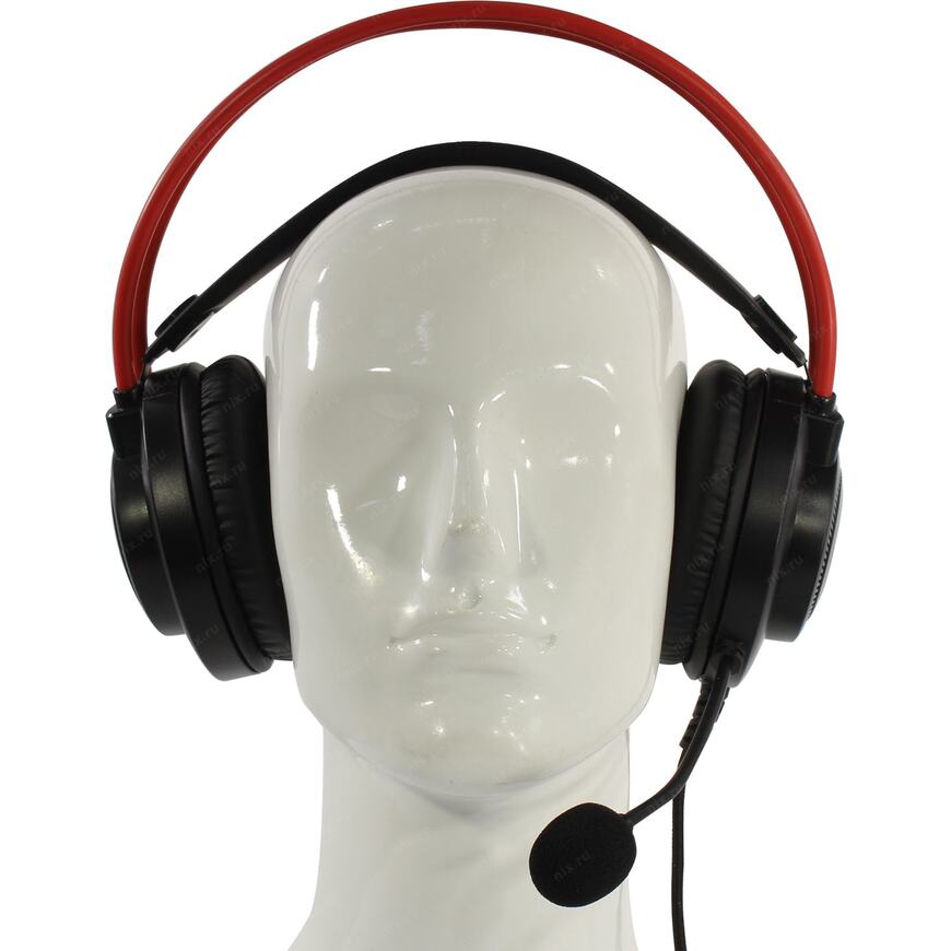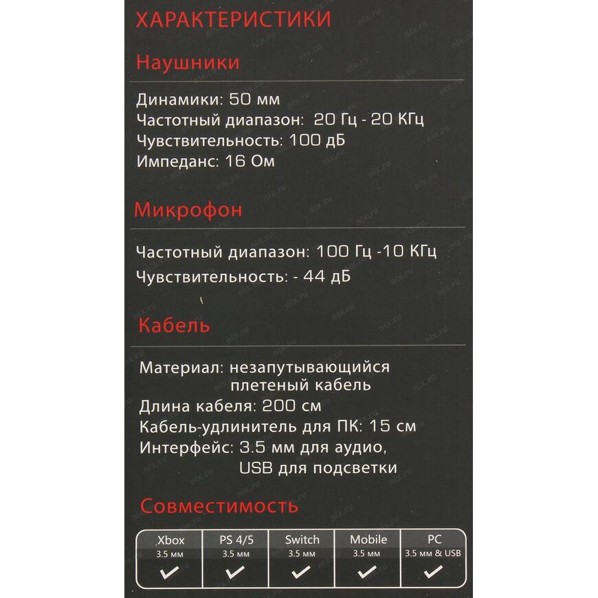 Игровая гарнитура с большими амбушюрами, самонатягивающимся оголовьем и микрофоном с шумоподавлением. Многоцветная подсветка корпуса (питание от USB).