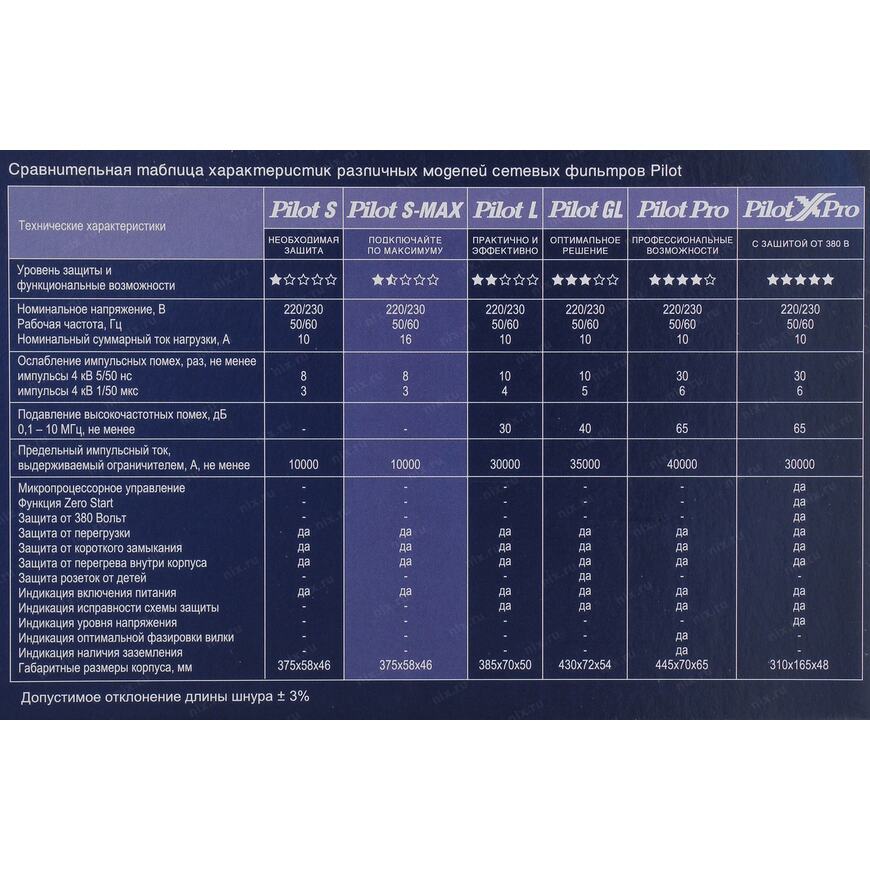 Базовая “бюджетная" модель, которая содержит в себе самые необходимые функции защиты бытовой и офисной техники от помех, возникающих в электросети. Сетевой фильтр Pilot S-MAX сделан на базе сетевого фильтра Pilot-S , отличие состоит в номинальной мощности подключаемой нагрузки. Для сетевого фильтра Pilot S-MAX она составляет 3,5 кВт. (против 2,2 кВт у Pilot S)