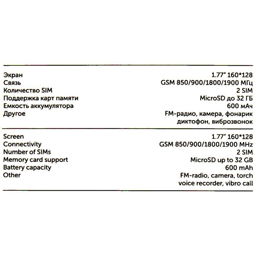 | Описание | Простой кнопочный телефон c емким аккумулятором, камерой, встроенным Bluetooth и micro SD |