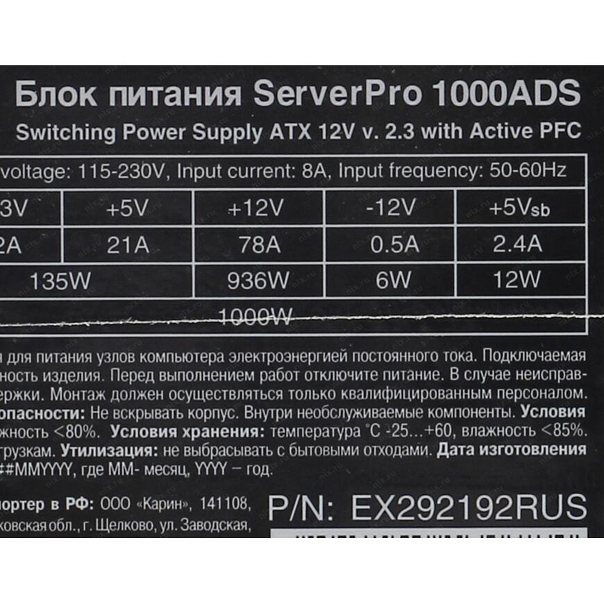 | Максимальная нагрузка | +3.3V - 22A, +5V - 21A, +12V - 78A, +5VSB - 2.4A, -12V - 0.5A ; Комбинированная нагрузка: +3.3V & +5V - 135 Вт |