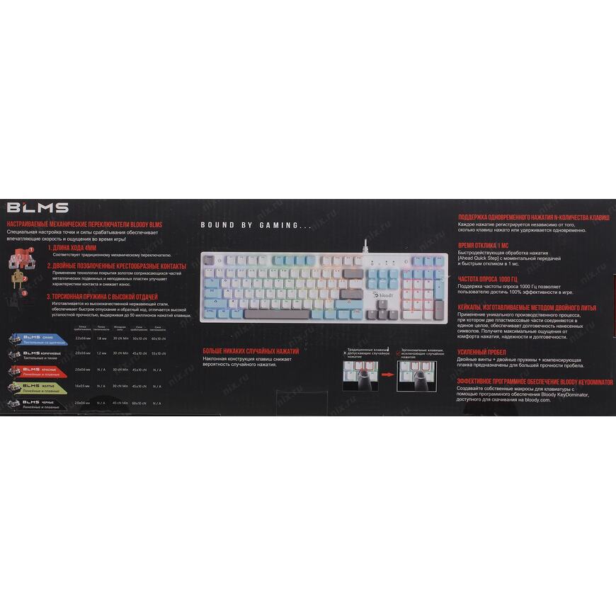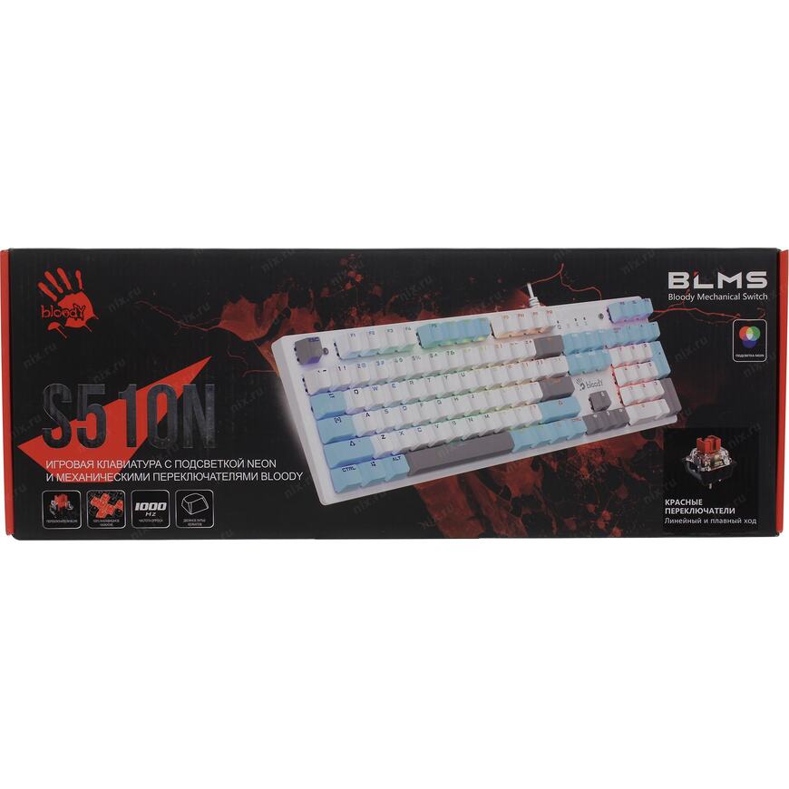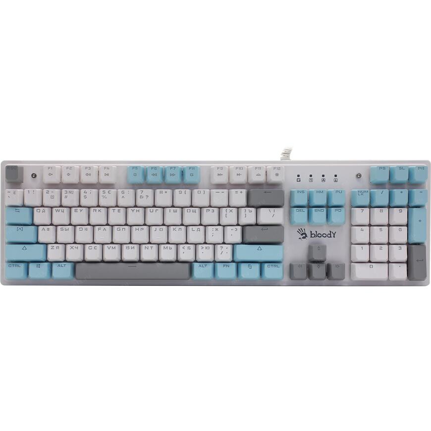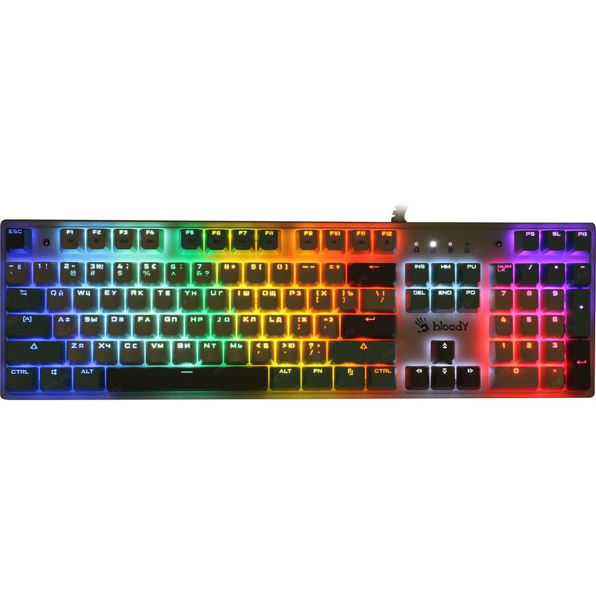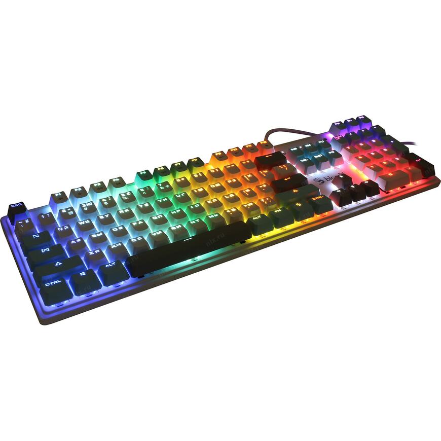 Игровая влагоустойчивая клавиатура с механическими клавишами и подсветкой символов. Используются оптические переключатели для уменьшения времени срабатывания.