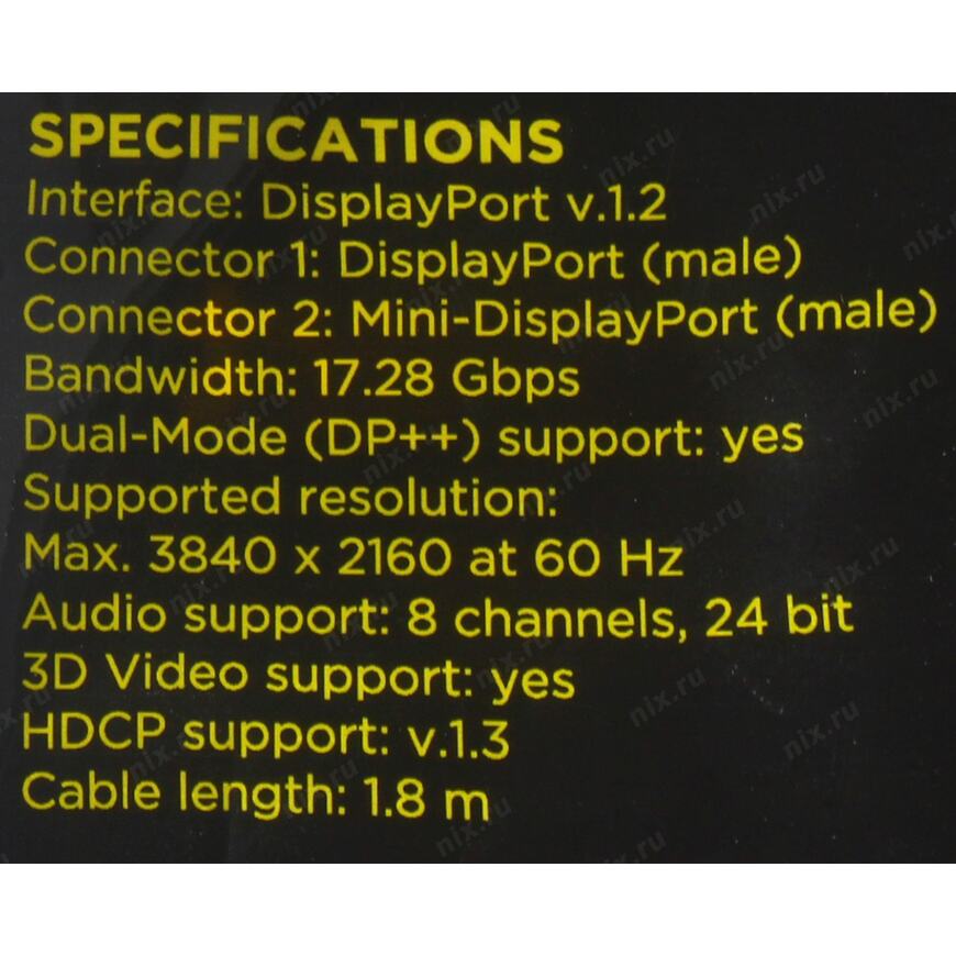 Кабель позволяет коммутировать устройства с разъемом mini DisplayPort и DisplayPort. Как правило, кабель необходим для соединения дисплея с компьютером, либо аудио и видеоаппаратуры с современным интерфейсом mini DisplayPort и DisplayPort.