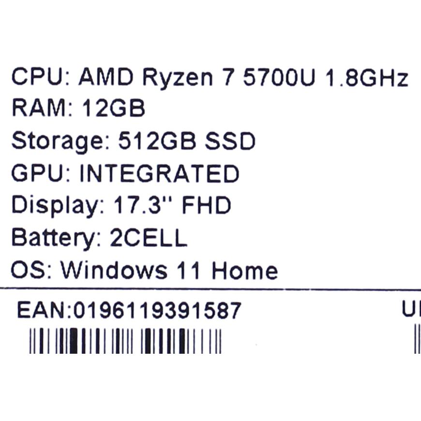 | Процессор ноутбука | AMD Ryzen 7 5700U (1.8 - 4.3 ГГц, 8 ядер, 15 Вт) |