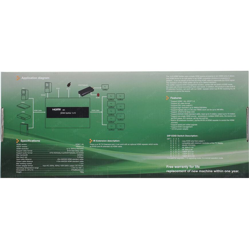 | Описание | Сплиттер позволяет подключить к одному источнику цифрового HDMI видео/аудио сигнала (медиаплееру, TV ресиверу и др.) одновременно 10 телевизоров или мониторов. Поддерживается передача звука, RS232, 4K Ultra HD 30 Гц и 3D. Возможно каскадирование сплиттеров. |