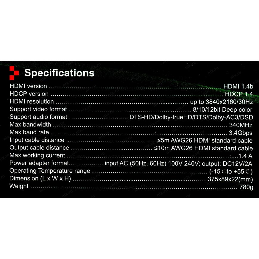 | Максимальная длина кабеля | 25 метров (10 метров от источника до разветвителя + 15 метров от разветвителя до дисплея) с разрешением 1920 x 1080 15 метров (5 метров от источника до разветвителя + 10 метров от разветвителя до дисплея) при использовании кабеля с диаметром проводника 26 AWG и разрешением 3840 x 2160 |