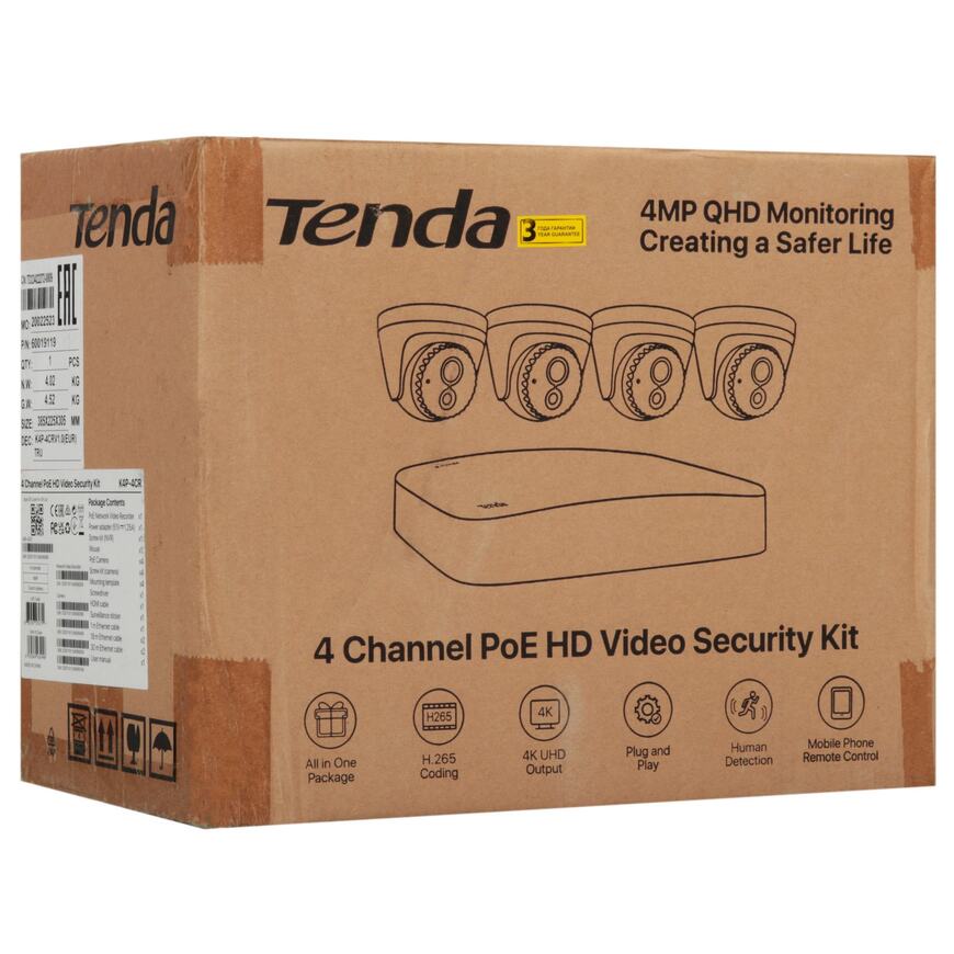 TENDA K4P-4CR Комплект видеонаблюдения ( 4-канальный PoE видеорегистратор 4K UHD + 4 Турельные PoE видеокамеры 4MP UHD, объектив 4мм)