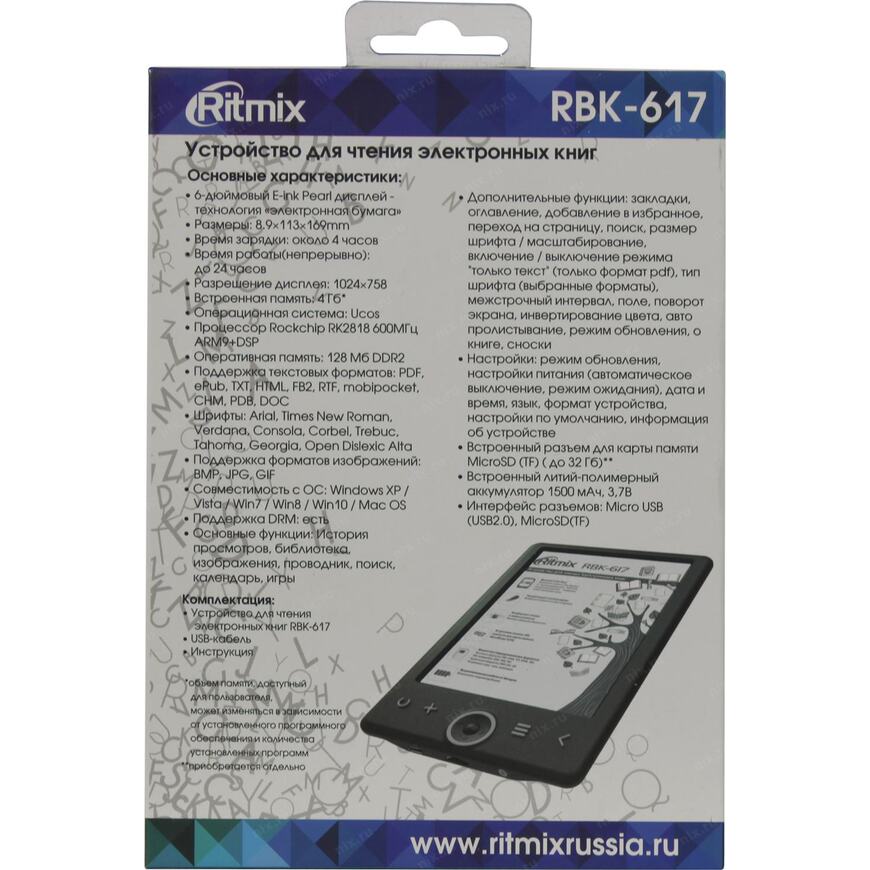 | Описание | Ritmix RBK-617 станет идеальной находкой для тех, кто предпочитает активный образ жизни. Благодаря малому весу и размеру ридер не займет много места, что позволяет брать его с собой куда угодно. |