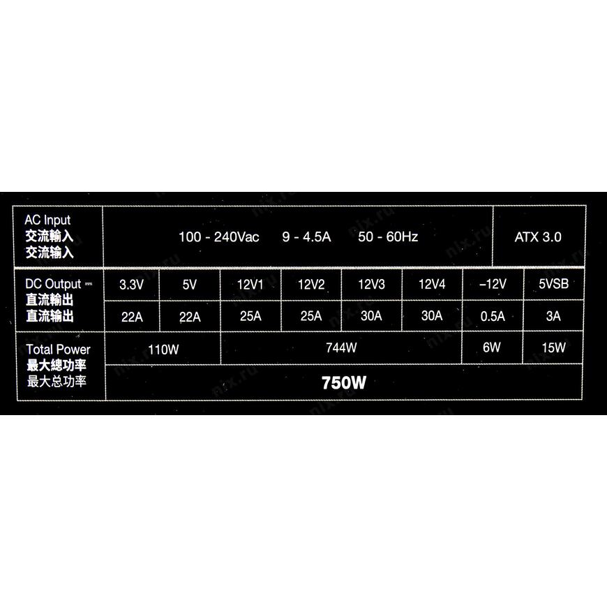| Максимальная нагрузка | +3.3V - 22A, +5V - 22A, +12V1 - 25A, +12V2 -25A, +12V3 -30A, +12V4 -30A, +5VSB - 3A, -12V - 0.5A; Комбинированная нагрузка: +3.3V & +5V - 110 Вт, 12V - 744 Вт |