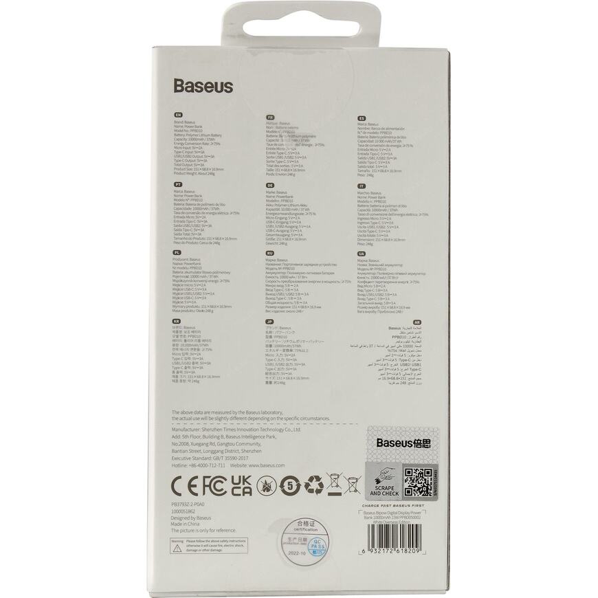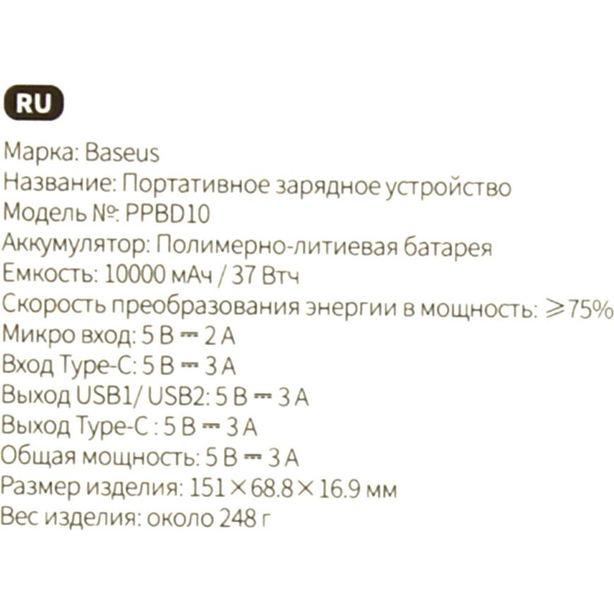 | Емкость аккумулятора | 10000 мАч (заявленная производителем ёмкость внутреннего аккумулятора Power Bank; реальная отдаваемая ёмкость Power Bank в пересчете на напряжение 5 В может отличаться в меньшую сторону) |